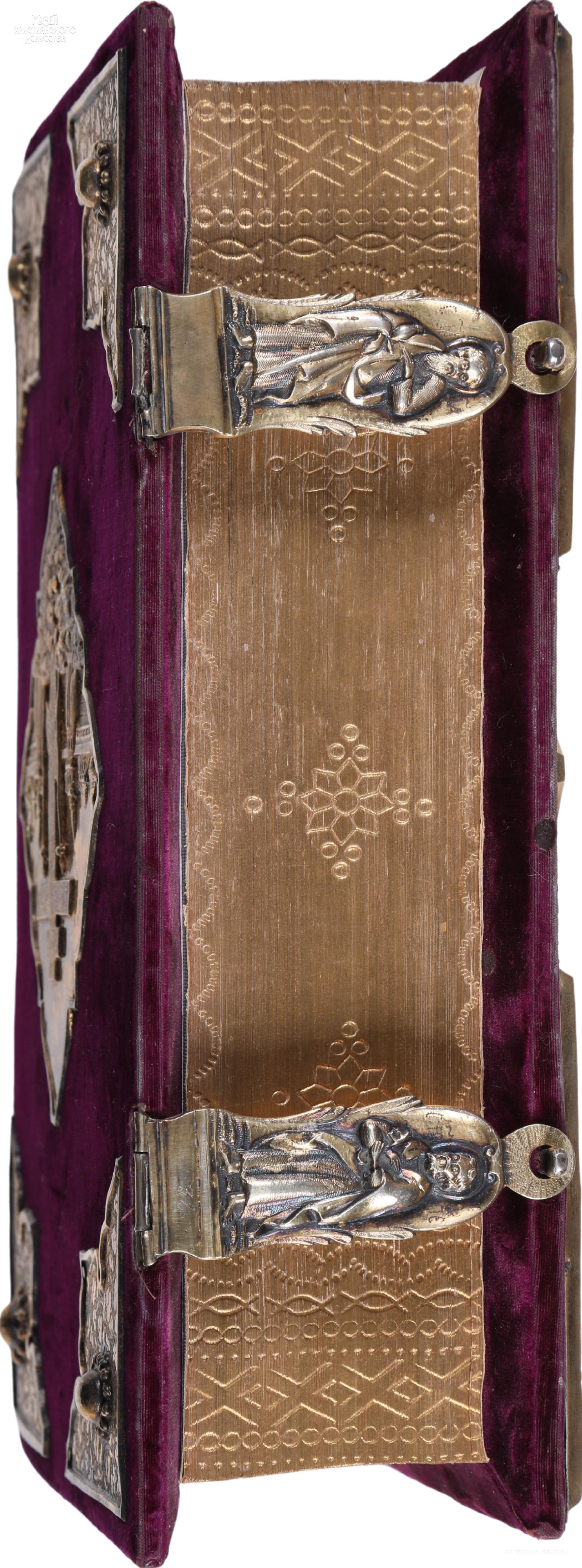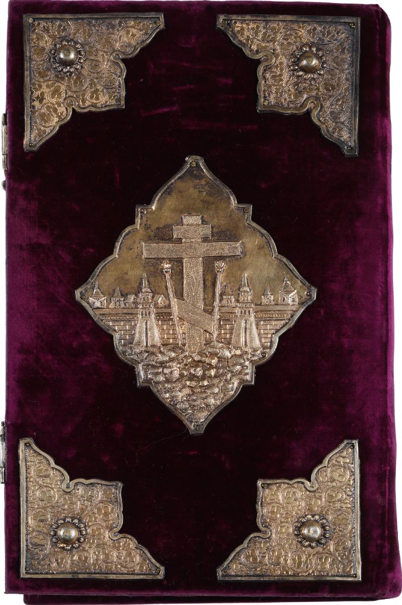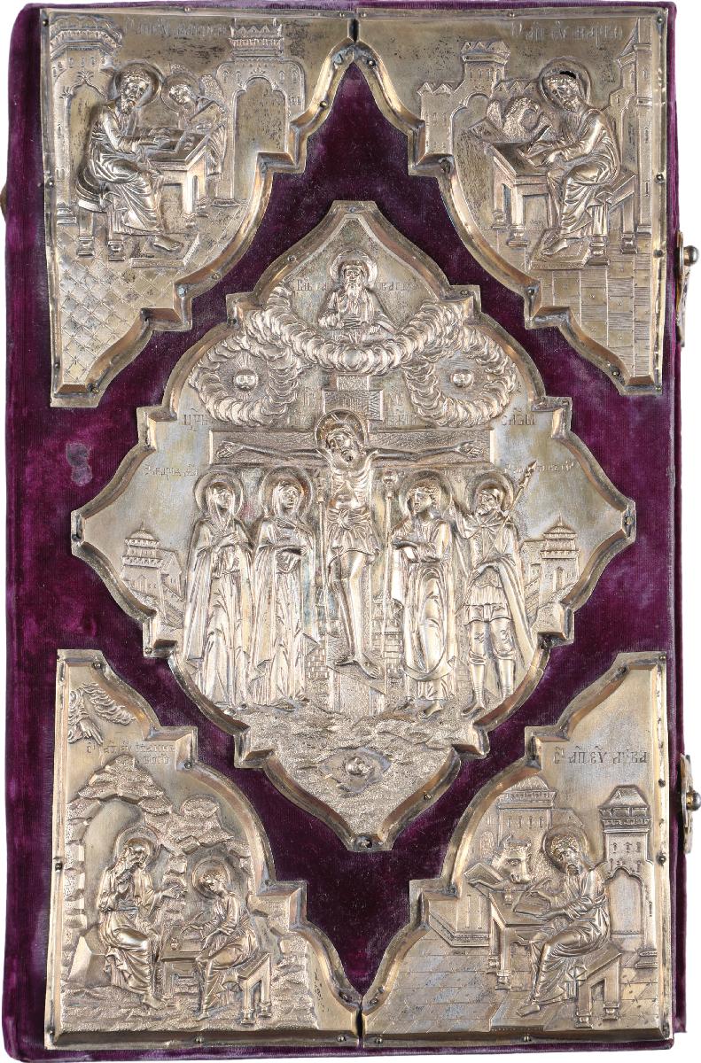Переплет XIX века, доски в фиолетовом бархате. На верхней крышке художественные высокорельефные накладки – «Распятие с предстоящими» в среднике и наугольники с изображениями евангелистов. Растительный орнамент наугольников на нижней крышке повторяет элементы верхней крышки; в среднике – изображение Креста с орудиями Страстей на Голгофе на фоне Иерусалима. Застежки «внахлест» с литыми изображениями апостолов Петра и Павла, четыре ножки-жуковины, обрез золотой.