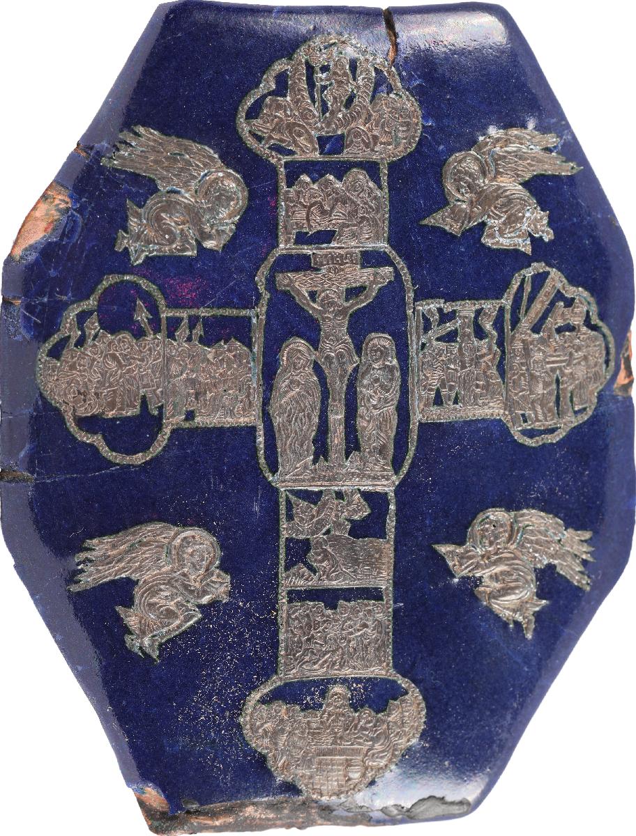 В центре восьмиугольной пластины расположен четырехконечный накладной крест с фестончатым обрамлением. В средокрестии - «Распятие» с двумя предстоящими. В девяти клеймах в ветвях креста расположены следующие композиции Страстей Христовых: «Тайная вечеря», «Омовение ног», «Моление о чаше», «Поцелуй Иуды», «Приведение к Пилату», «Бичевание Христа», «Несение креста», «Снятие с креста», «Воскресение Христово». В четырех углах - накладные фигуры летящих ангелов.
