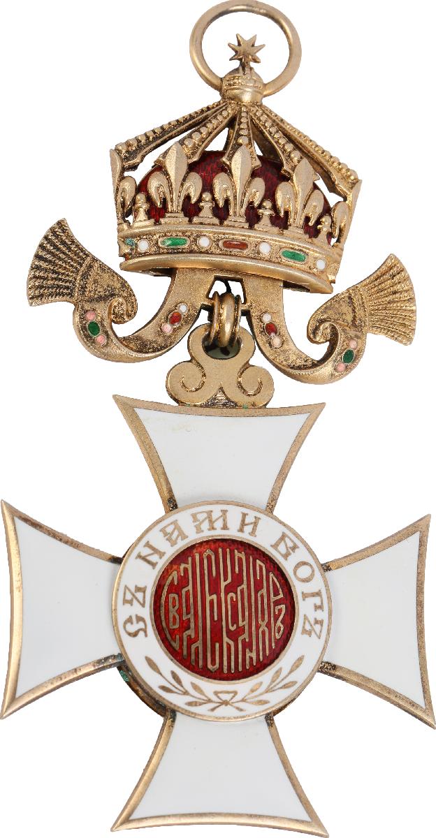 Орден выполнен в виде равноконечного креста с оглавием в виде короны и ленты с кистями.