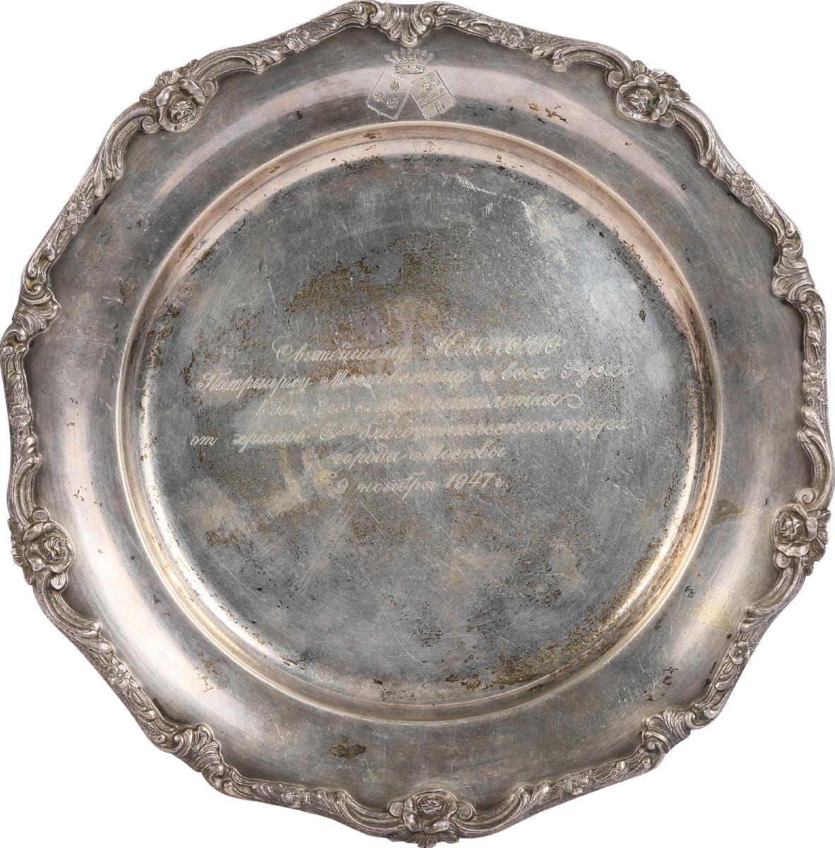 «Святейшему Алексию//Патриарху Московскому и Всея Руси//в день Его Семидесятилетия//от храмов 3-го благочиннического округа//города Москвы//9 ноября 1947 года