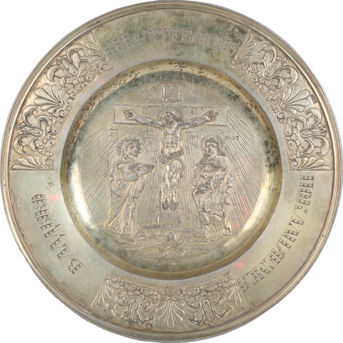 По борту тарели чередуясь с травными сегментами помещена выгравированная надпись: «КРЕСТУ ТВОЕМУ//ПОКЛАНЯЕМСЯ//ВЛАДЫКО».