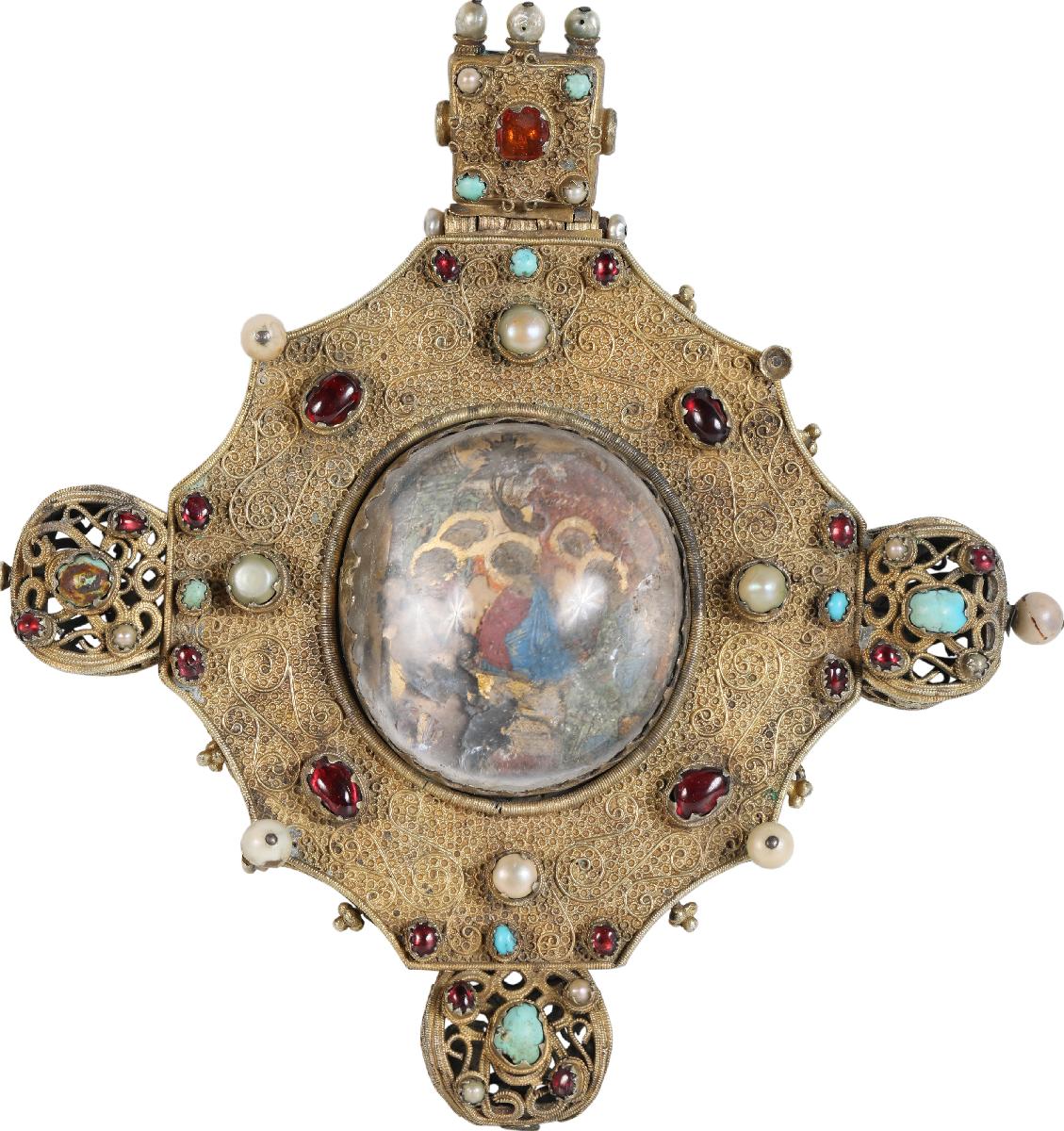 серебро, драгоценные камни, хрусталь, бирюза, альмандины, жемчуг, темпера, золочение, скань, миниатюра.Размер: