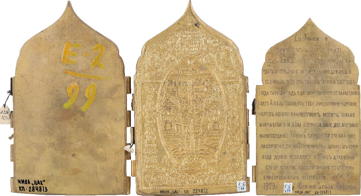 На обороте одной из створок гравирована надпись: «День Причащения//великолепнейший Праздникъ въ//году! Освященный божественною благо//датью отрадною умилительною для души//сознаешь себя озаренным ярким светомъ//Тогда паришь над тщетою и мирскою печалью, как// будто Ангел освободитъ тебя лучезарною чертою// через которую переступить могут только//впечатления и дела возвышенные, доблественные//милосердные. Потом сливается это светлое//настроение с житейским обыденным хотя//еще долго остается въ насъ духовная//стезя святое воспоминание объ этомъ//божественномъ мгновении//1879 год//Княжна Татьяна Юсупова