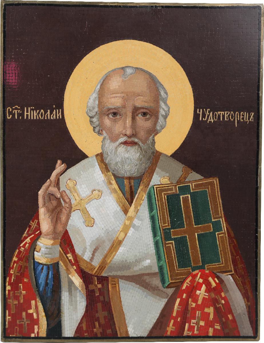 Мозаичная икона представляет один из редких сохранившихся образцов художественного творчества насельниц Серафимо–Понетаевского монастыря, образованного в 1860–е годы при селе Понетаевка близ Арзамаса группой сестер, покинувших Серафимо–Дивеевскую обитель. Некоторые из них, и в том числе игуменья Евпраксия (Занятова), будучи послушницами Дивеевской общины, в конце 1850–х годов обучались «греческой иконописи и мозоическому искусству» в Санкт–Петербурге при Академии художеств. Традиции трудоемкого и дорогостоящего искусства римской мозаики были перенесены ими в Понетаевскую обитель. О стилистике произведений, вышедших из монастырской мастерской, можно судить по двум подписным произведениям: иконам Святителя Николая Мирликийского Чудотворца и мученицы царицы Александры, поднесенным сестрам обители в 1896 году царю–страстотерпцу Николаю II и его супруге после коронации, а также по иконе Божией Матери «Умиление» (Всех радостей Радость»конца ХIХ – начала ХХ века века, вывезенной из обители после ее закрытия. Иконописное творчество сестер основано на принципах академической школы. Образно– стилистические и технические качества понетаевских мозаик не уступают работам столичных мозачистов. По композиции, рисунку, колориту и мелким деталям изображения образ в точности повторяет икону святителя Николая Чудотворца 1896 года. Сходство заметно и в приемах моделировки формы, разработке светотени на одеянии. Безусловно, обе мозаики исполнялись с одного оригинала. Небольшое отличие в изображении лика и в надписи свидетельствует о творческом подходе художниц к решению образа. Сравнение двух памятников, один из которых принадлежал царской семье и не был доступен для копирования, вполне определенно подтверждает атрибуцию мозаики как произведения понетаевской мастерской.