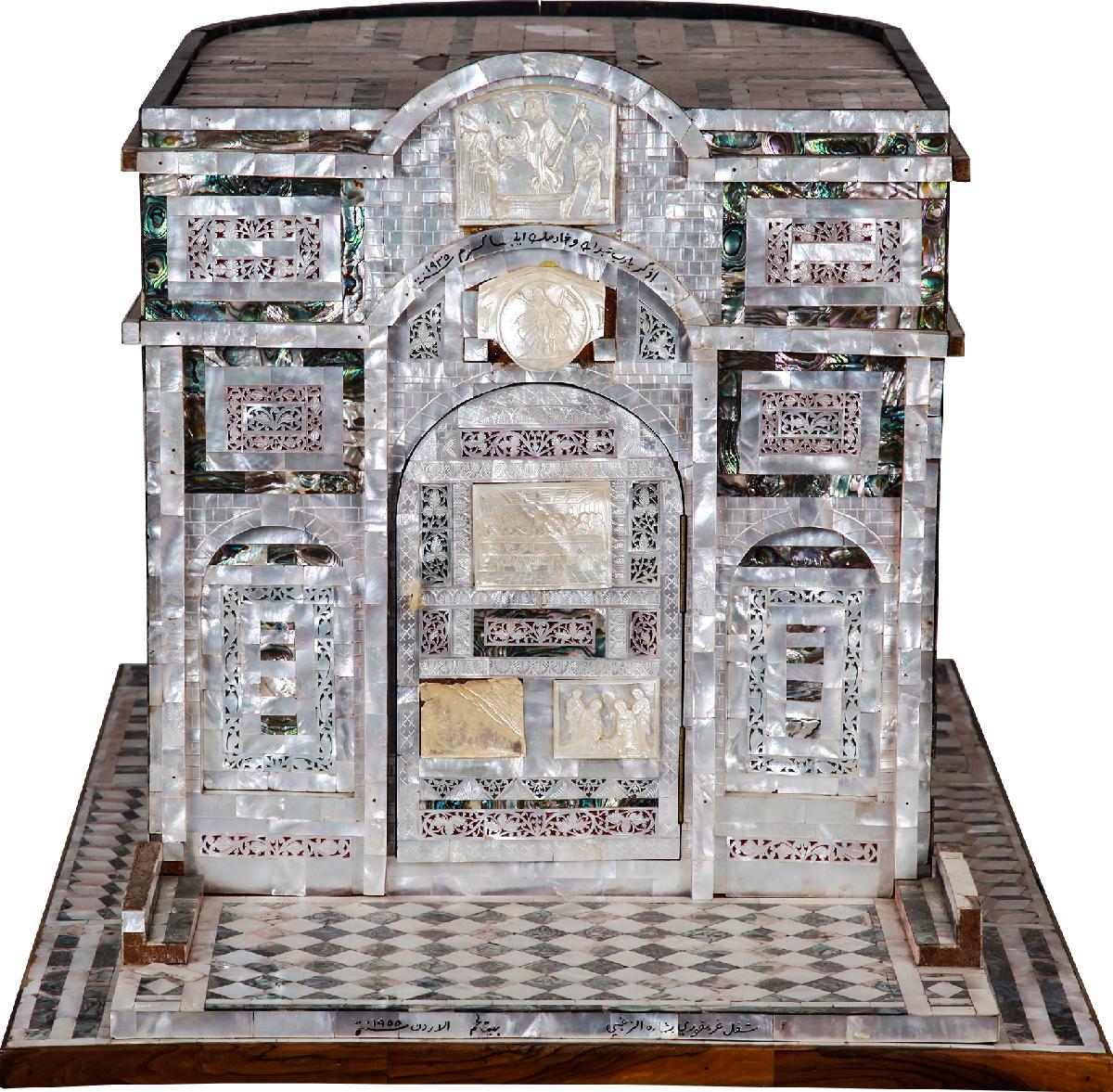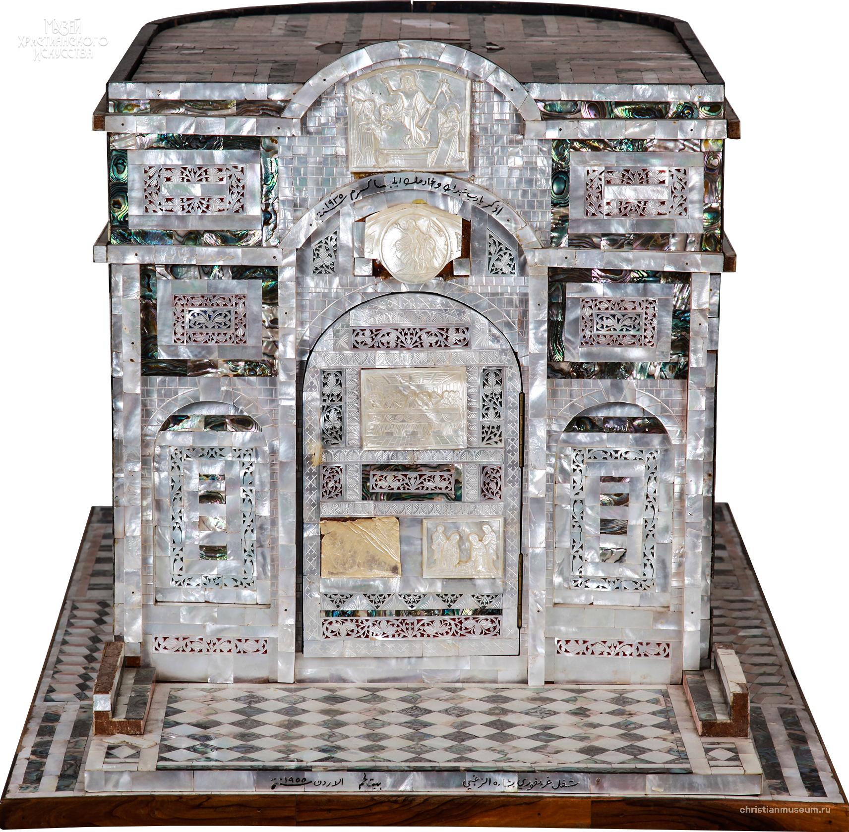 Макет Кувуклии выполнен из перломутровых пластин. На крыше полностью утрачен купол. На месте купола по дереву перекрестье из пластин зеленого перламутра. Пластины розового перламутра огибают место купола. Изображения в арочных нишах кувуклии (слева направо): Вознесение Господне, Огненное восхождение пророка Илии, Распятие Господне, ап. Андрей, свят. Василий, св. Марина, пророк Иоанн Предтеча, Крещение Господне, Моление о чаше, свят. Афанасий, Христос на троне с Богоматерью и прор. Иоанном Предтечей, Введение во храм. Дверца кувуклии открывается. На дверце перламутровые резные иконы: сверху-Тайная вечеря, внизу справа- Рождество Христово, слева икона утрачена. Над дверцей выпуклая икона с образом "Восстание от гроба».