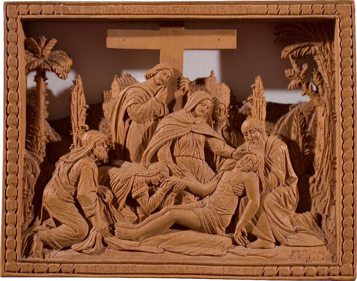 На первом плане представлены Никодим и Иосиф Аримафейский, поддерживающие распростертое тело Христа, снятое со креста. Последовательным углублением рельефа мастер добивается эффекта осязаемости сюжетной композиции. Второй план составляет Богоматерь с двумя женами. За группой святых жен возвышается фигура апостола Иоанна Богослова, склоненного у креста. Пальмы, кипарисы и листья аканфа составляют наполнение дальнего плана.