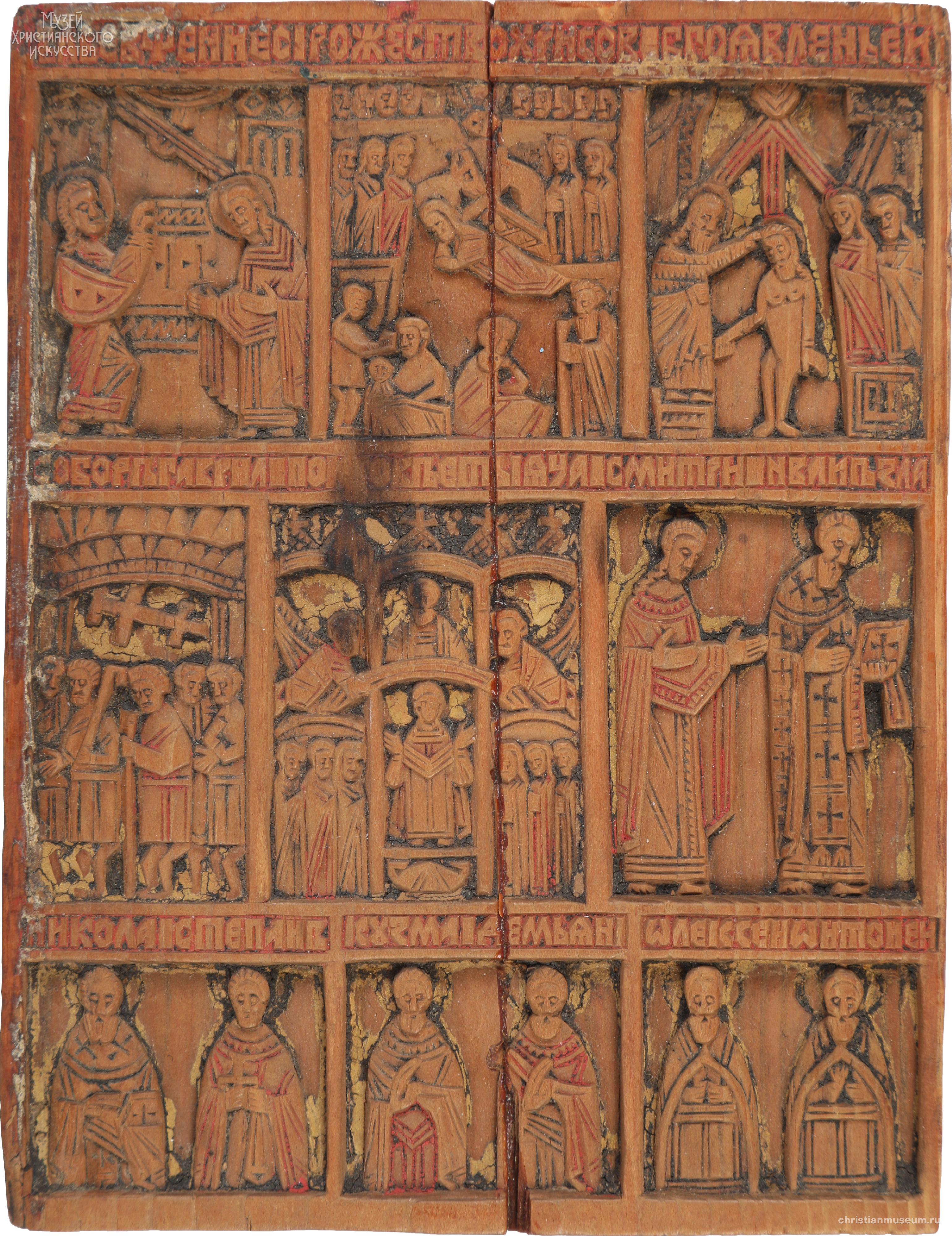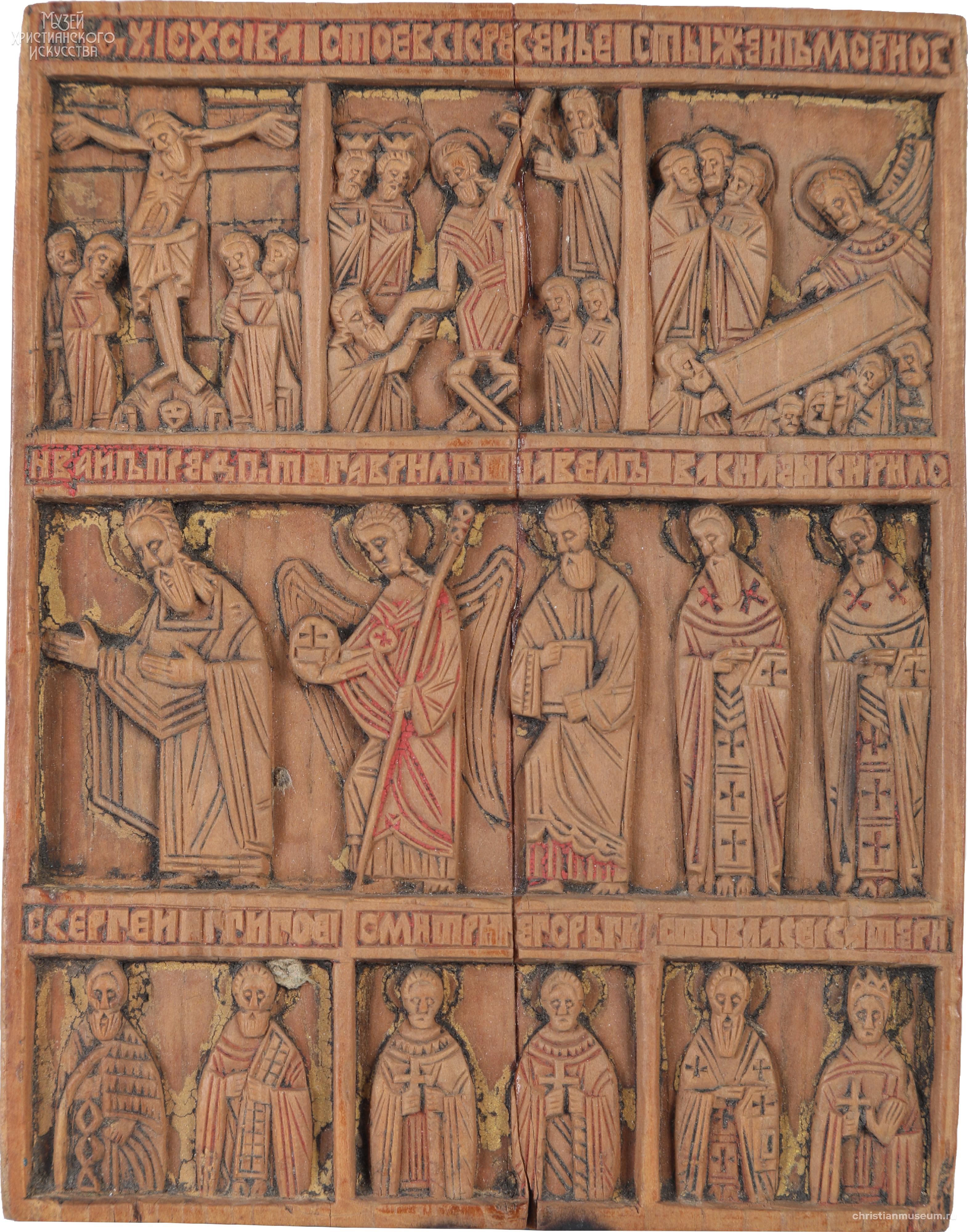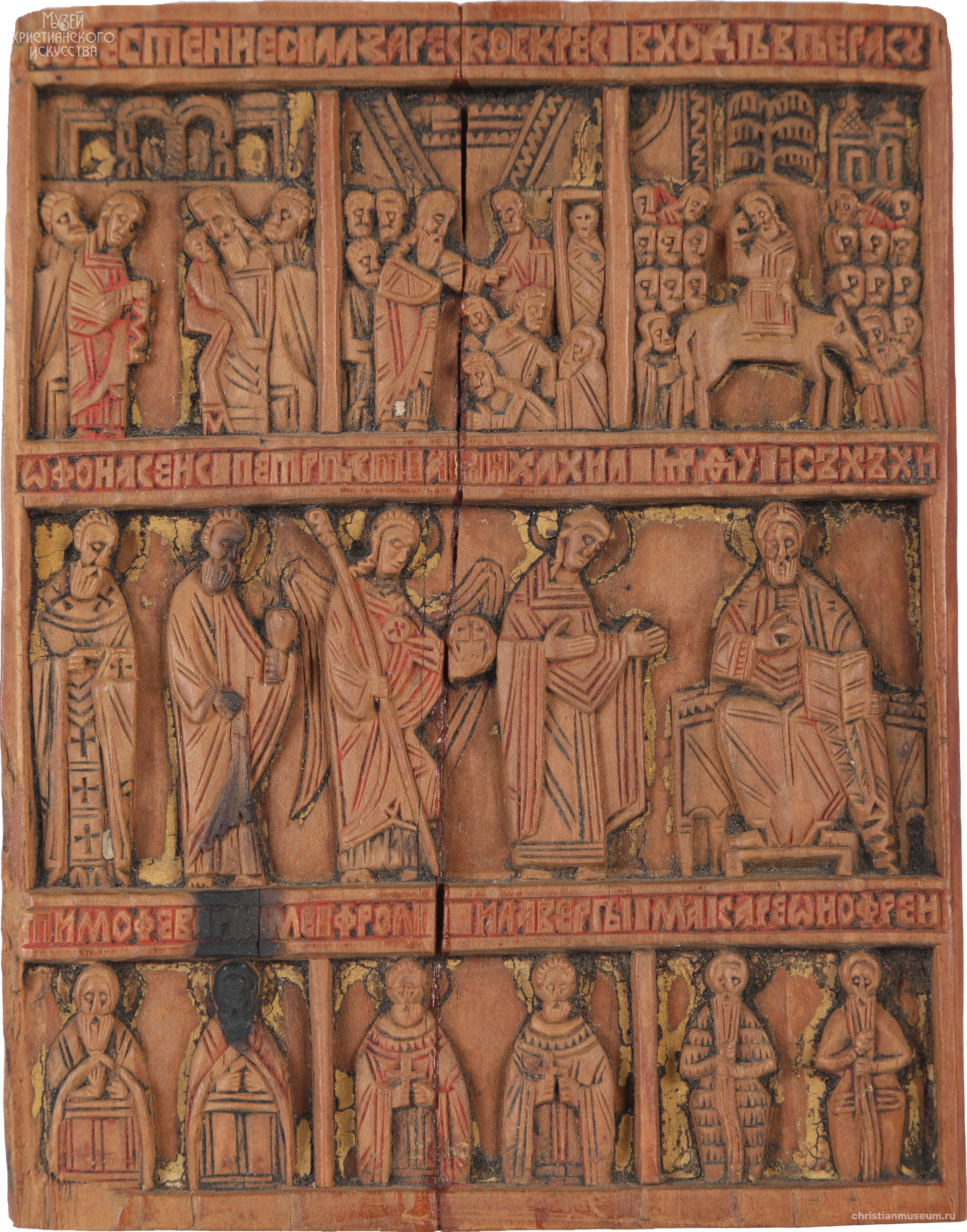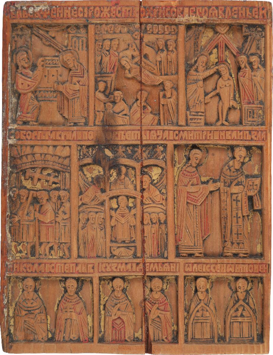 Четырехчастный складень-иконостас, имеющий три ряда изображений, которые разделены полосами обронных надписей. Праздничный чин включает двенадцать праздников: Благовещенье, Рождество Христово, Крещение, Сретение, Воскрешение Лазаря, Вход Господень в Иерусалим, Распятие, Воскресение Христово-Сошествие во ад, Жены-мироносицы у гроба Господня, Вознесение, Святая Троица, Преображение. Во втором ряду деисуссный чин: в центре восседает Спаситель с раскрытым Евангелием на колене и благословляющим жестом правой руки. Слева и справа к нему обращены фигуры деисусного чина. Фланкируют чин композиции: Собор архангела Гавриила и Покров Богоматери слева, Введение Богоматери во храм и Снятие со Креста справа. В нижнем ряду иконостаса представлены фронтально и поколенно святые, среди которых святители, мученики, преподобные.