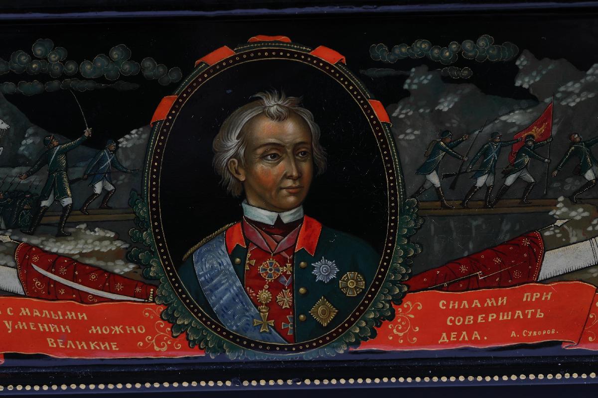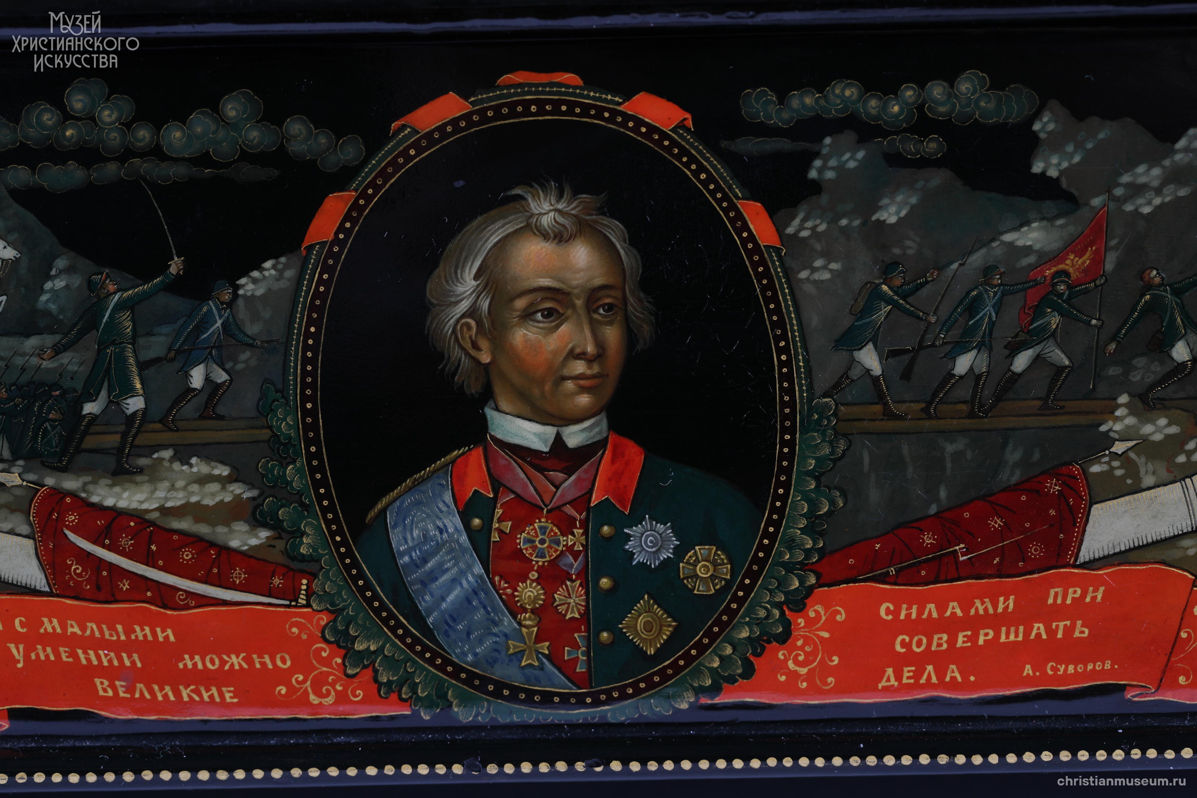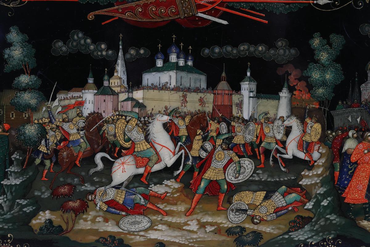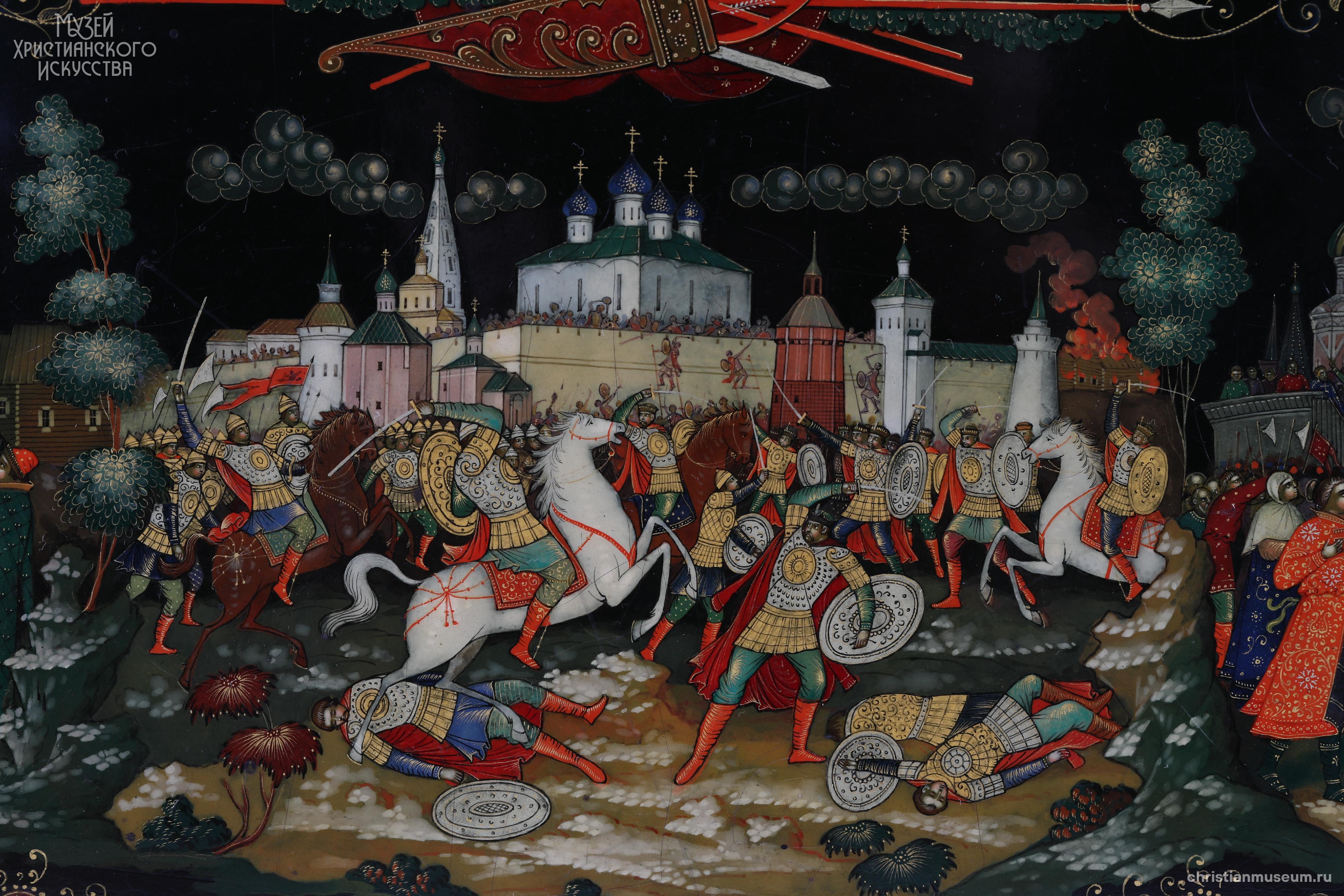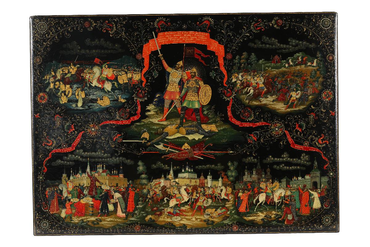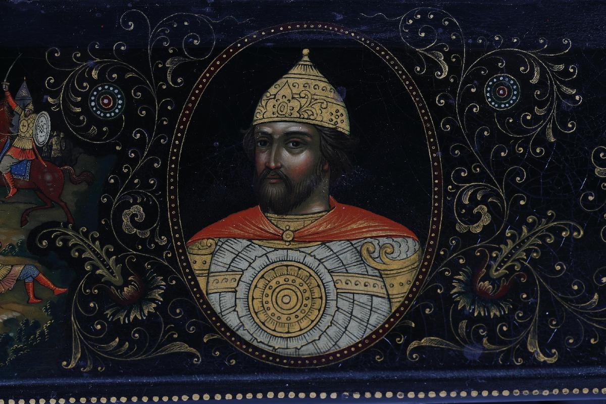 Подарок И. В. Сталина Святейшему Патриарху Алексию I (Симанскому). На верхней крышке шкатулки в средней части представлены великие князья-воины Александр Невский и Димитрий Донской. На святых кольчуги, высокие сапоги, шлемы. У Дмитрия Донского в правой руке меч, в левой – копье. Александр Невский правой ногой попирает распростершегося ниц немецкого рыцаря и держит в правой руке меч, в левой – щит. Над святыми простирается лента с надписью«Пусть вдохновляет вас в этой войне мужественный образ наших великих предков – Александра Невского, Дмитрия Донского, Кузьмы Минина, Димитрия Пожарского, Александра Суворова, Михаила Кутузова. И. Сталин». В верхней плевой части батальная сцена сражения Александра Невского с рыцарями, часть рыцарского войска представлена погибающей в водах Чудского озера. В верхней правой части сцена сражения на Куликовом поле. В нижней части три сцены, посвященные событиям Смутного времени: призывание народа к ополчению купцом Мининым, бой на площади перед монастырем, въезд в Кремль героев ополчения Минина и Пожарского. Надпись на ленте в правой части: «Лучше честная смерть, чем позорная жизнь. Д. Донской». Надпись на ленте между сценами в левой части: «Кто с мечом к нам войдет от меча и погибнет А. Невский».