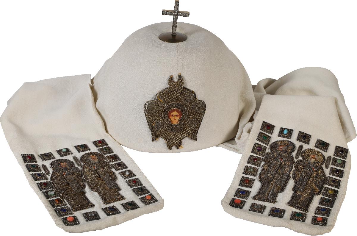 Куколь сферической формы, обтянут шелковой наметкой с характерным покроем: один конец спускается по спине, два коротких на грудь. Лобная сторона украшена накладкой с херувимом. На маковке круглая дробница и крест. На правом воскрылии клеймо с фигурами «Святители Василий Великий и Григорий Богослов». На левом воскрылии клеймо с фигурами «Святители Иоанн Златоус и Григорий Двоеслов». Фигиры с живописным личным выложены сканью и окружены 22-мя декоротивными дробницами.