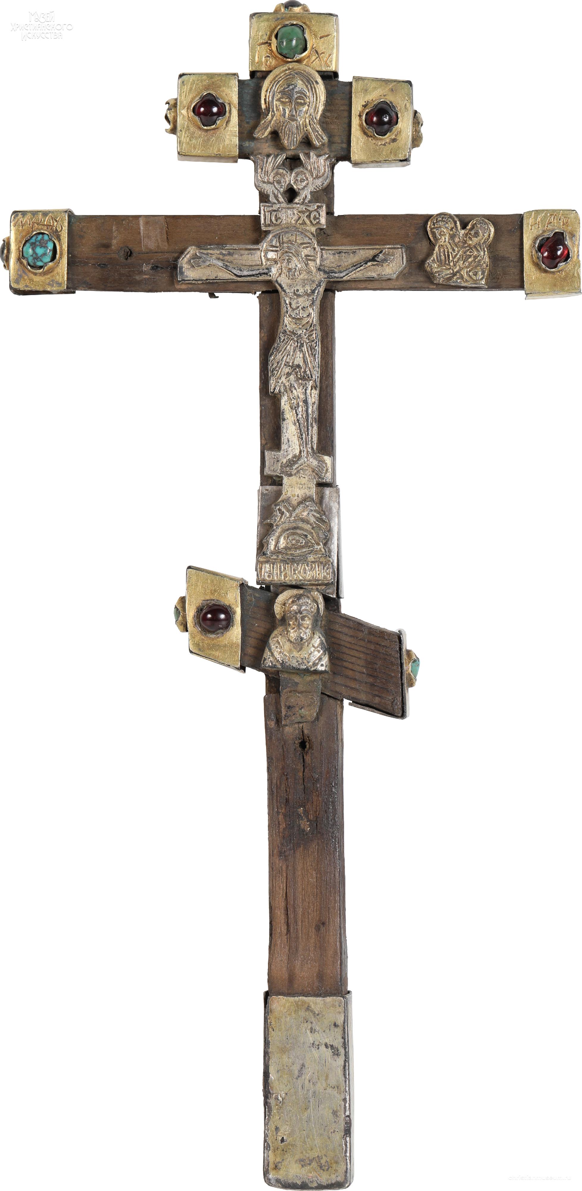 Крест деревянный, восьмиконечный с двумя прямыми и одной косой перекладиной. На лицевой стороне, в средокрестии, наложено золоченое Распятие. На перекладине с правой стороны смонтированы полуфигуры предстоящих апостолов. На левой стороне накладная пластина утрачена. На концы креста надеты наконечники, украшенные камнями в высоких глухих кастах. Рукоять обложена серебряной золоченой накладкой.