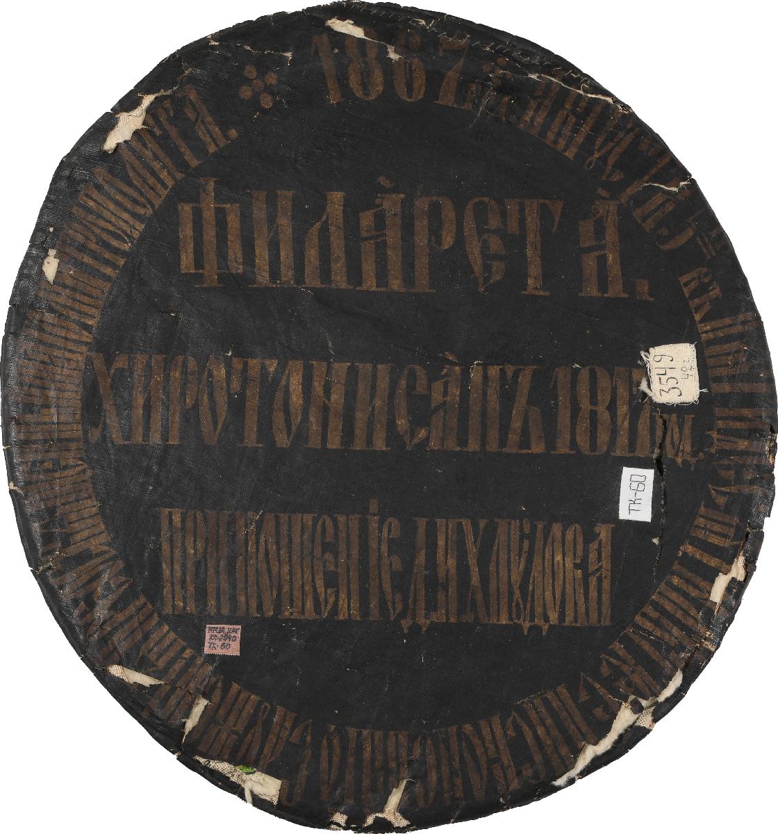 На обороте золотом: «1867 год августа 5-го в ПЯТИДЕСЯТИЛЕТИЕ ЕПИСКОПСКАГО СЛУЖЕНИЯ ПРЕОСВЯЩЕННЕЙШЕГО МИТРОПОЛИТА ФИЛАРЕТА. ХИРОТОНИСАНЪ 1817 ГОД. ПРИНОШЕНИЕ Д.И.ХЛУДОВА»Иконография: