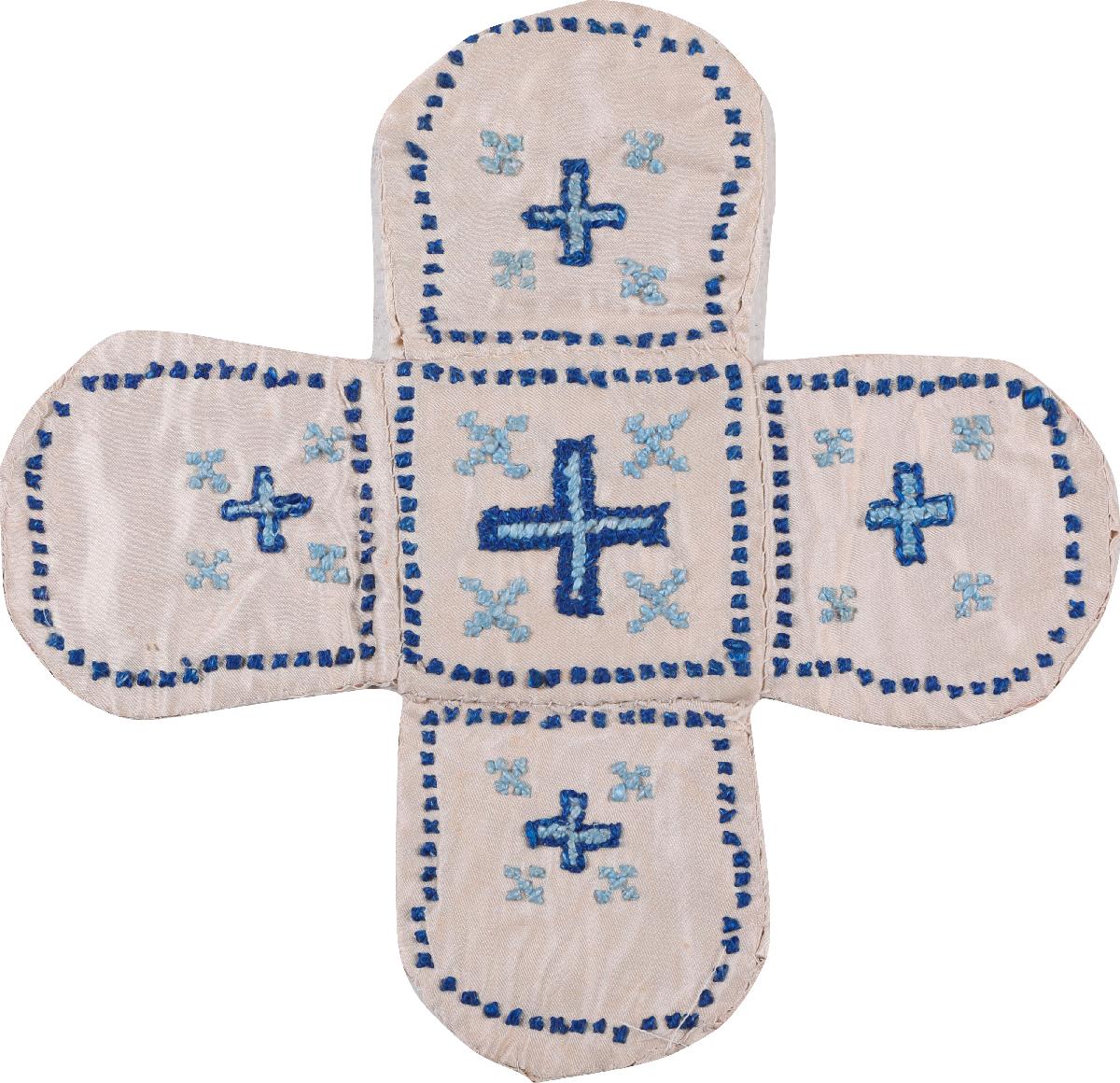 Покровец разрезной из белого шелка с синей вышивкой, скорее всего, был сшит самим владыкой Афанасием, когда он находился в ссылке.