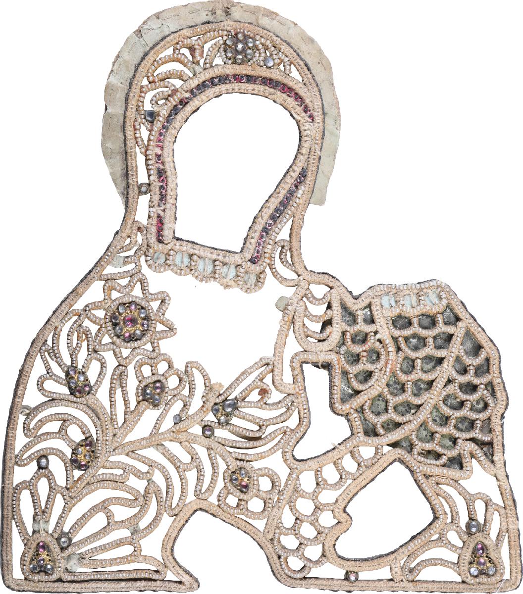 Ажурная вышивка речным жемчугом по шнуру с декоративными вставками из стекол.