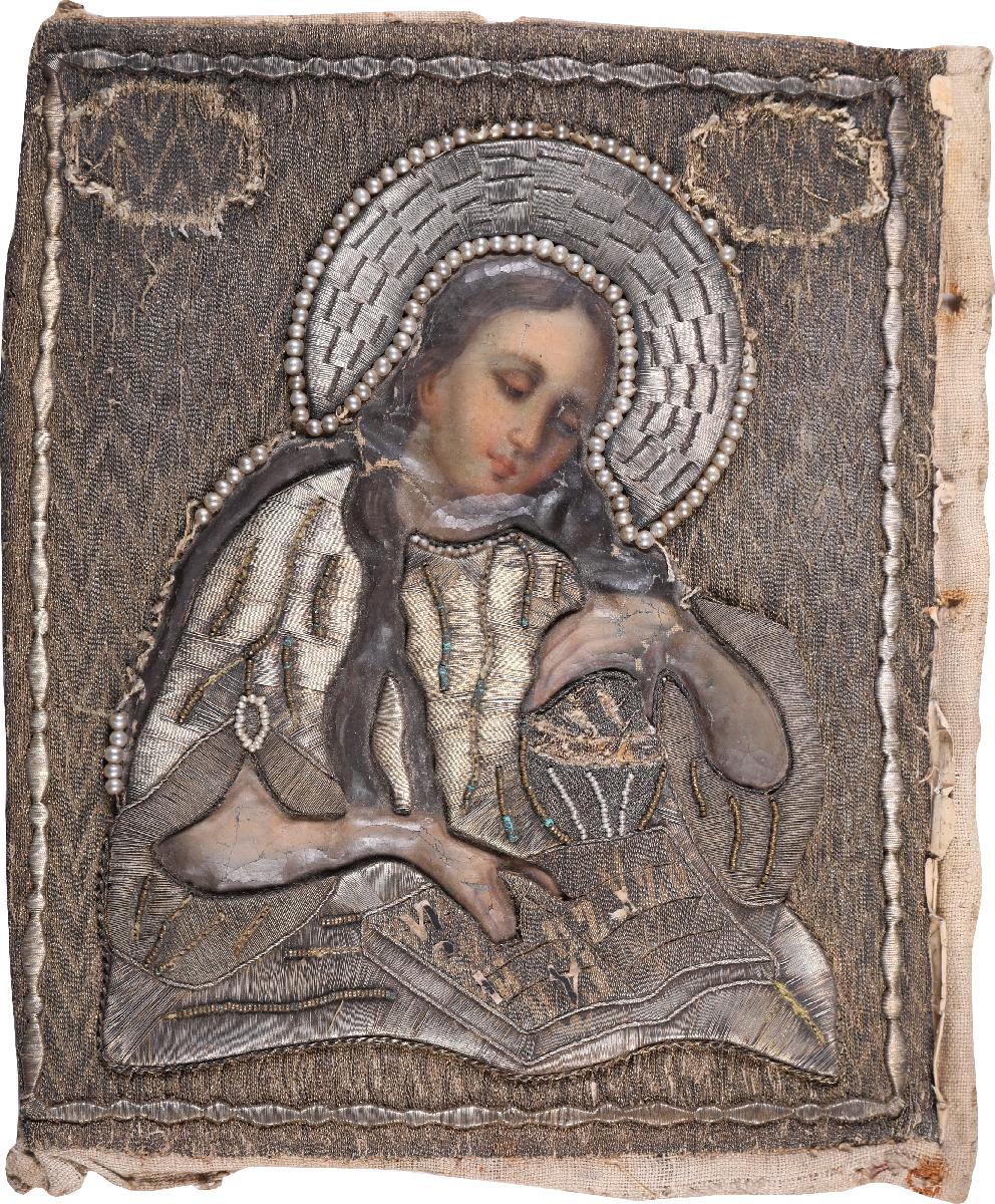 ткань, серебряные нити, золотные нити, искусственный жемчуг, грунт, шитье, маслоРазмер: