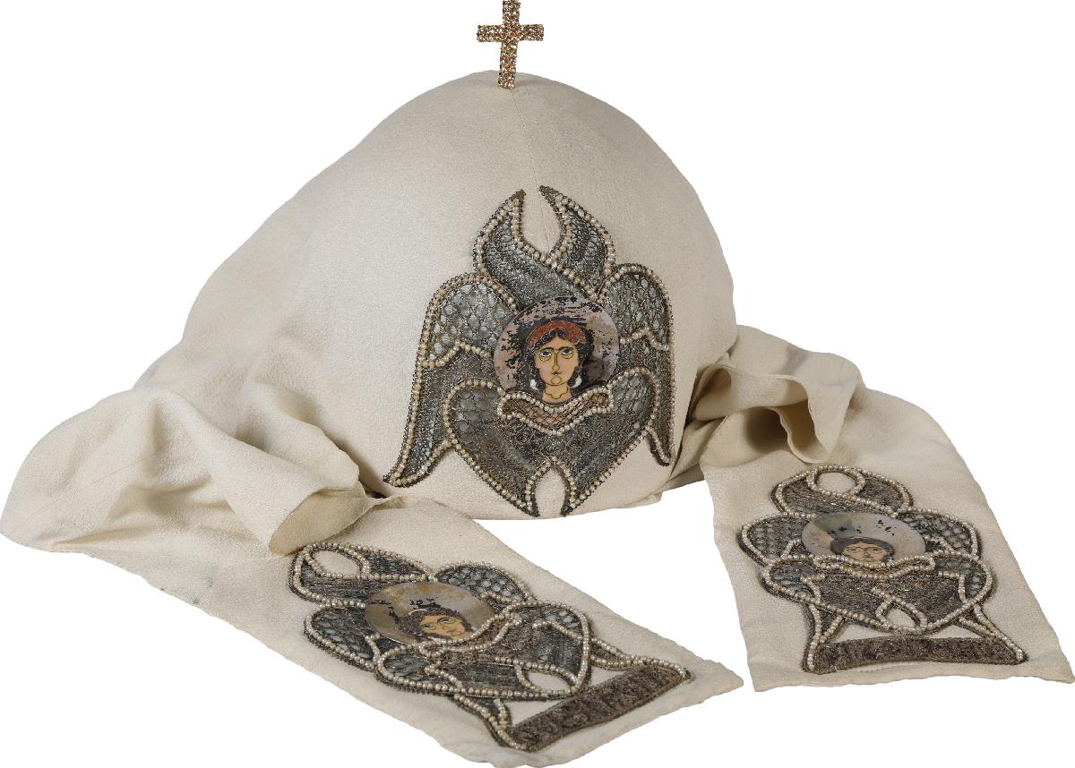 диаметр тульи 18,5 см, высота тульи 23,5 см, длина наметки 95,0 см, ширина наметки 77,5 см, длина воскрылий 30,0 см, ширина воскрылий 13,3 см; крест 4,1 х 3,0 х 0,3 см, в кресте 68 стразИконография: