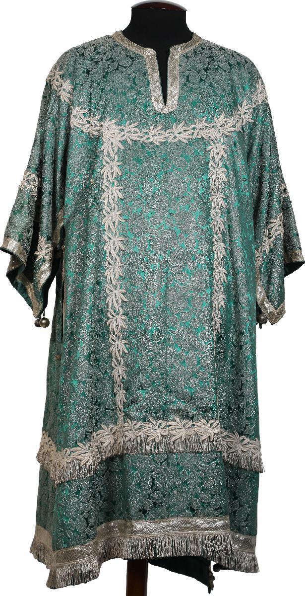 Саккос из шёлковой бирюзового цвета парчи с серебряным растительным орнаментом мелкого рисунка. По всему периметру как на передней стороне, так на спинке обшит серебряным галуном: внутренняя сторона рукавов и резные боковины саккоса, а так же горловина с вертикальным разрезом обшиты узким галуном; края рукавов и подол более широким. На спинке нашита восьмиконечная звезда с четырехконечным крестом. Линии оплечия, две вертикальные полосы по переду, горизонтальные полосы по рукавам и подолу выполнены из белой декоративной прорезной тесьмы. Разрезные боковины саккоса соединяются 14 пуговицами с 14 петлями из серебряного шнурка. С внутренней стороны саккос подложен подкладкой из шёлковой ткани голубого цвета. Палица ромбовидной формы с лентой, которая перекидывается через плечо на правую сторону. На нижнем и боковых углах кисти из серебряной спиралевидной бахромы. По периметру палица обшита серебряной спиралевидной бахромой.