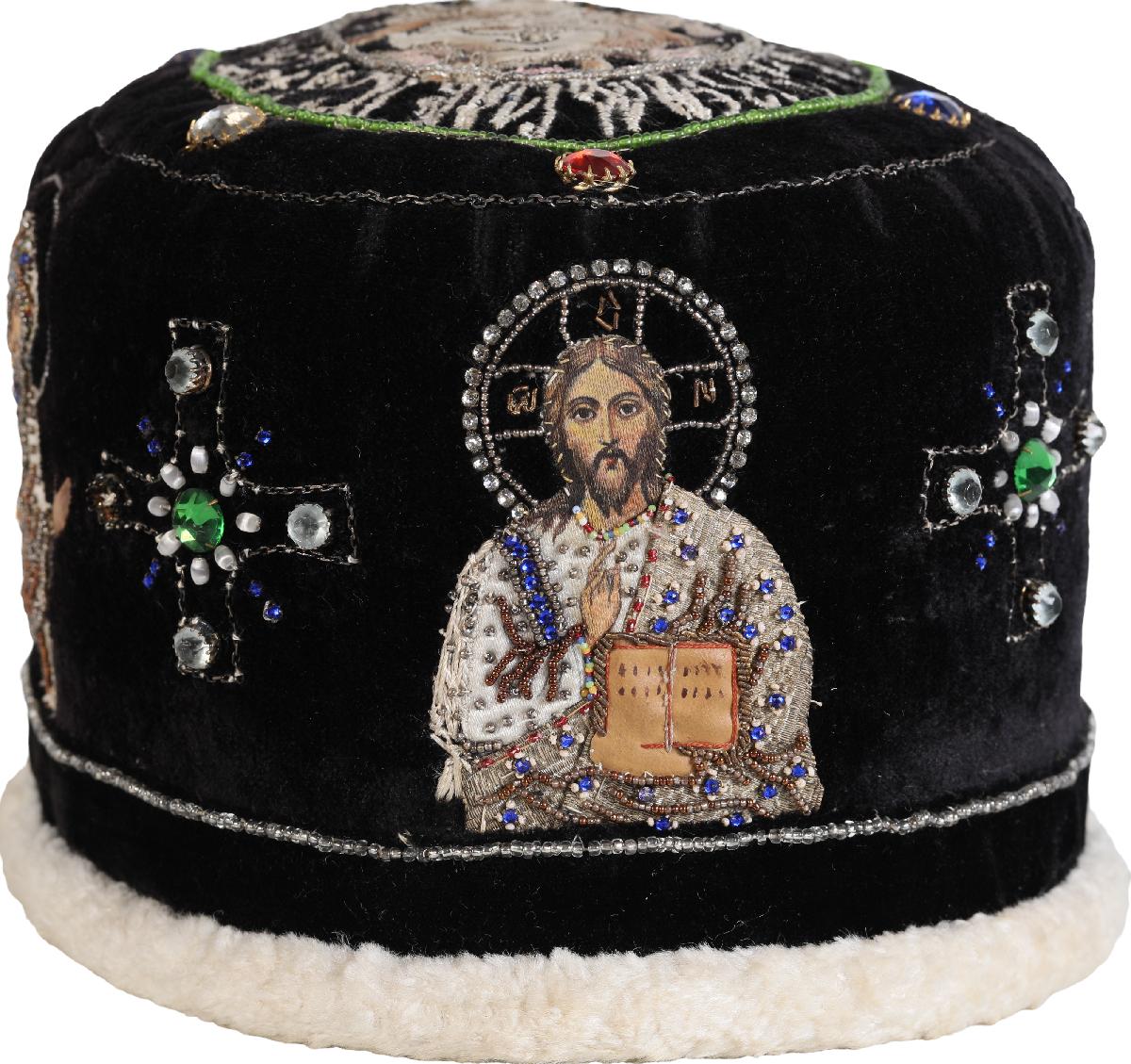 Митра с круглым плоским верхом, невысокой прямой тульей и опушкой в виде валика сшита из черного бархата. По бархатному фону шелковыми и серебряными нитями вышиты: наверху - Господь Саваоф, на тулье - трехфигурный Деисус и «Распятие Христово с серафимами»(по мотивам эскиза росписи кисти В.Васнецова для Владимирского собора в Киеве). Контуры, разделки одежд вышиты бисером. Некоторые детали - Евангелие у Христа, Крест в композиции Распятия Христа выполнены аппликацией из кожи. Личное написано маслом. По нижнему краю митра обшита белым искусственным мехом.