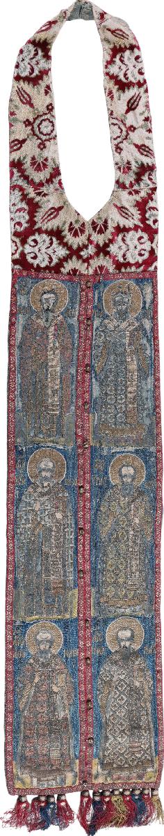 На епитрахили вышиты фронтально в рост шесть святителей, попарно: Василий Великий и Иоанн Златоуст, Николай Мирликийский и Григорий Богослов, Афанасий и Кирилл Александрийские. По сторонам от нимбов золотной нитью вышиты их имена. Правые руки святых подняты в святительском жесте, в левых держат Евангелия. Границей клейм служат только поземы и тканая орнаментальная тесьма (по красному фону чередующиеся серебряные и золотные S и Х-образные элементы), которой обшиты края епитрахили. Фигуры - с обобщенным контуром, довольно приземистые, мощные, с большими головами. Черты ликов крупные и очень выразительные. Лики изображены в легком ракурсе, но взгляд обращен на зрителя. Светотеневая моделировка выполнена постепенным переходом стежков более темного шелка в светлый (как бы плавью). Личное шито очень тонким некрученым шелком телесного цвета "в раскол" и "атласным швом" "по форме". Рисунок передан черным шелком. Доличное шито цветными шелками слабой крутки швами в косой ряд. Зарукавья, кресты на облачениях, Евангелия выделены пряденой золотной нитью "в прикреп", нимбы и омофоры - пряденой золотной и серебряной нитью "в прикреп" по настилу. Первоначальный фон - синяя шелковая ткань. Иордань сшита из турецкого золотного бархата XVII века (вероятно, пришита позднее). Подкладка - синяя крашенина.