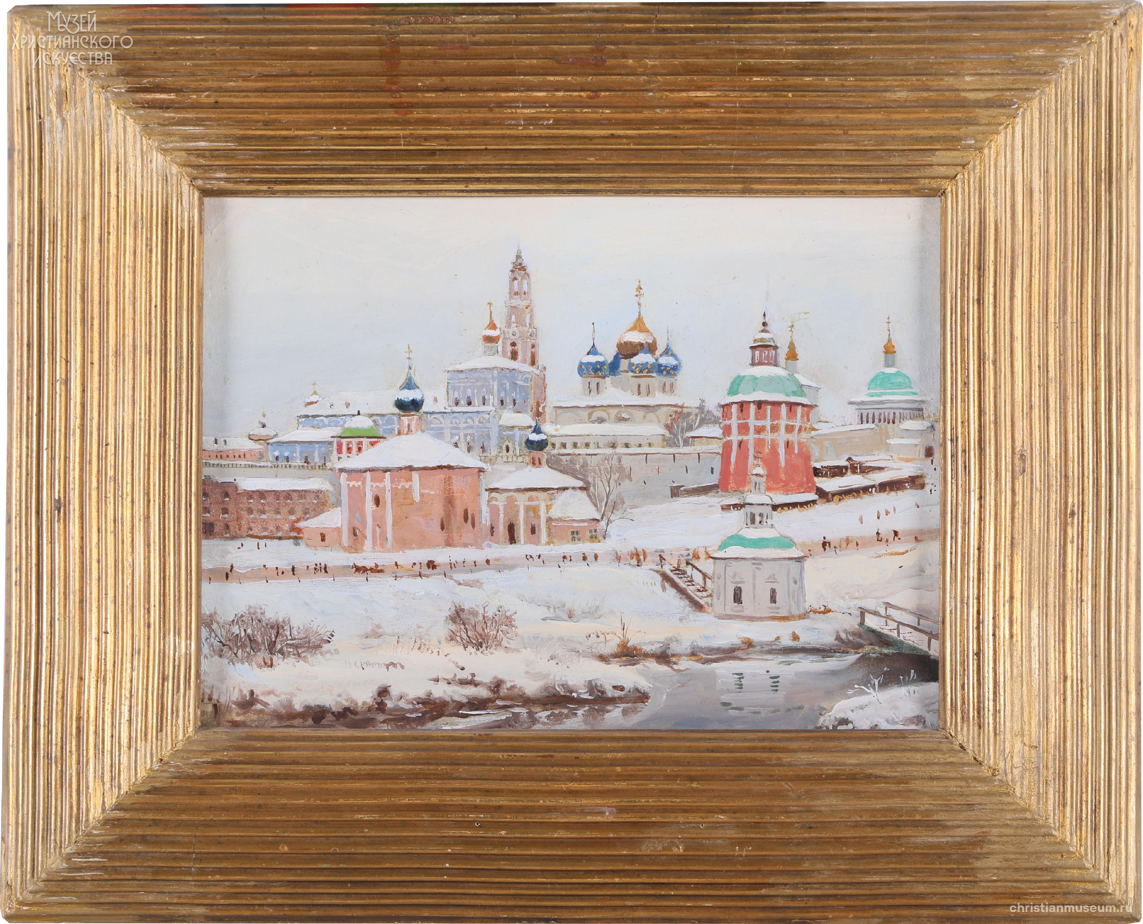На картине изображена зимняя панорама Троице-Сергиевой Лавры. На переднем плане – река Кончура, мостик и белое здание Пятницкого колодца. Ослепительная белизна снега и голубизна неба подчеркивают разноцветье стен и куполов монастырских храмов, что создает радостное, праздничное мироощущением. Такую раскраску лаврские постройки имели в начале XX века: розовые Введенская и Пятницкая церкви, небеленая красного кирпича Пятницкая башня с зеленой крышей, однотонный Трапезный храм и надвратная церковь Рождества Святого Иоанна Предтечи с одной главой, розовая колокольня. Картина кажется наполненной морозным воздухом и светом зимнего солнца.