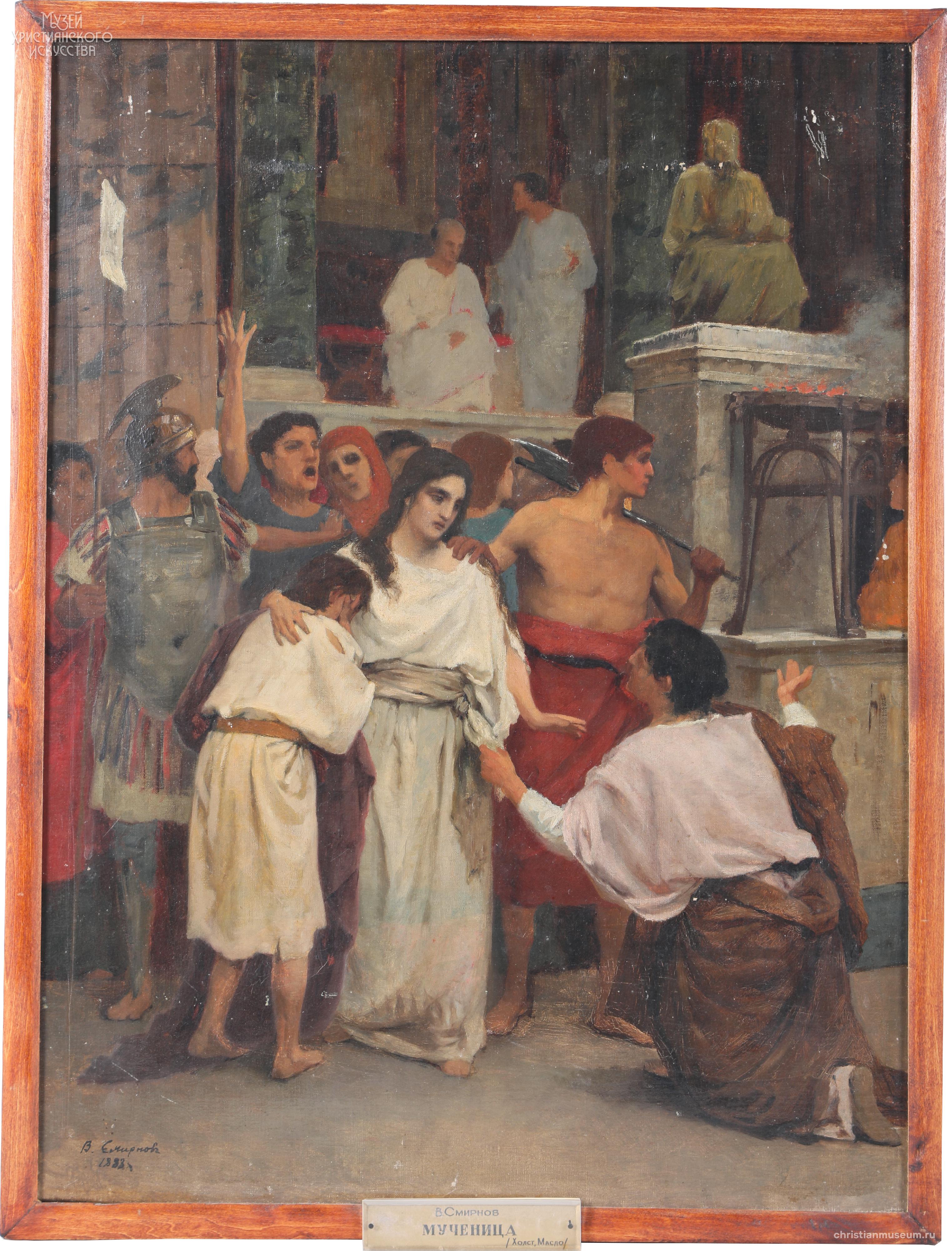Сюжетом картины стала сцена из эпохи гонений на первых христиан, а именно момент прощания мученицы со своими родными. В центре – молодая женщина в белых одеждах с распущенными по плечам волосами, которая по решению суда должна принять мученическую кончину за веру. Правой рукой она обнимает плачущего мальчика-подростка. Палач с обнаженным торсом и закинутой на плечо секирой готов вести её на казнь. На переднем плане на коленях стоит мужчина в белой тунике и коричневой тоге. Левой рукой он схватил мученицу за край её одежды, а правой указывает на жертвенник, умоляя одуматься и принести жертву языческим богам. Действие происходит на фоне роскошной римской архитектуры. На заднем плане – группа людей, сдерживаемых римскими воинами, сенаторы и другие стаффажные фигуры.