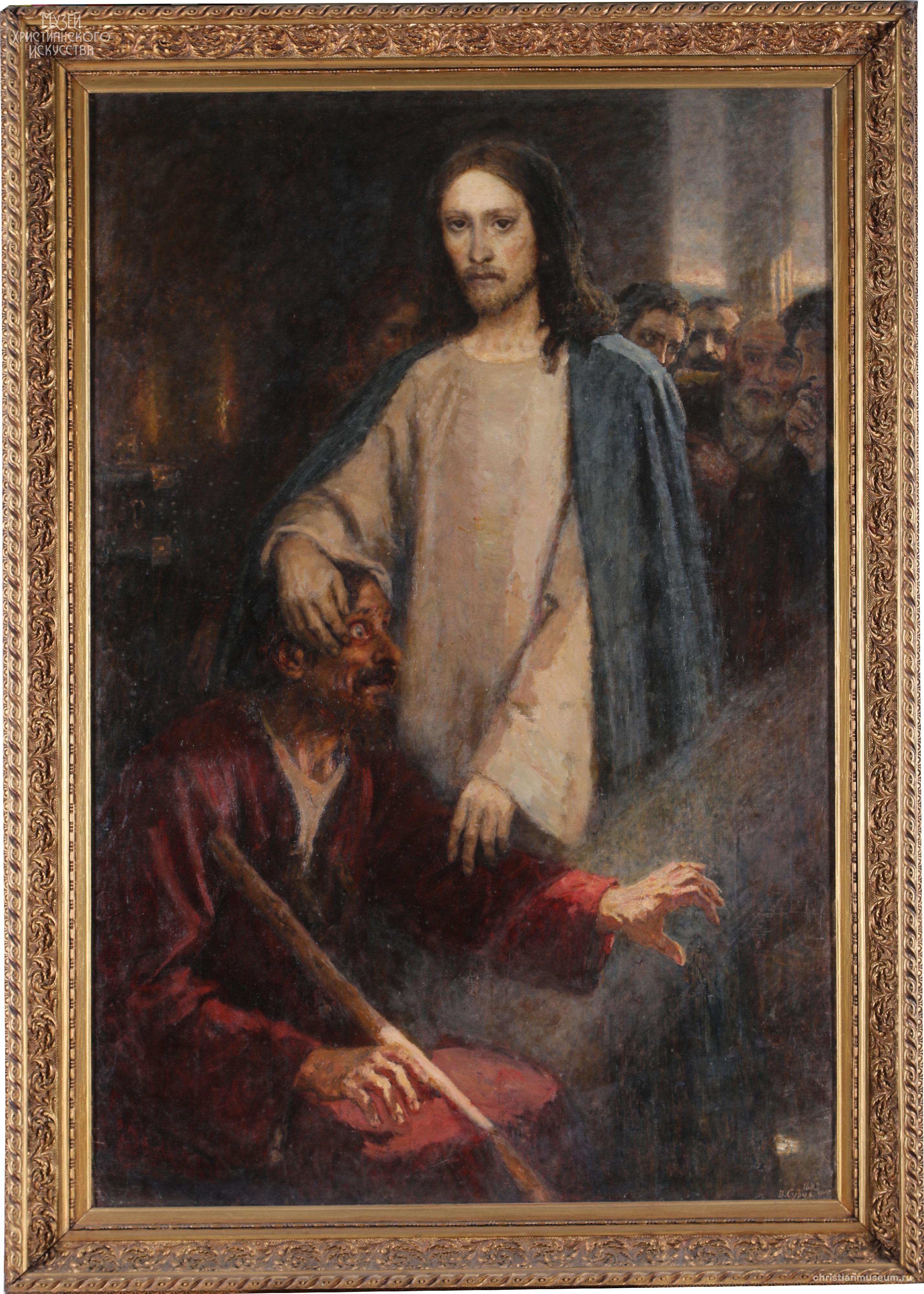 Монументальная фигура Христа занимает практически все пространство холста. На Нем свободная белая хламида с наброшенным на левое плечо синим гиматием. Его напряженный взгляд направлен прямо на зрителя. Правая рука Христа тяжело и устало легла на голову слепца. Левой Он едва касается судорожно вытянутой руки спасаемого. Еще не видящий ничего из-за ослепившего его света, человек выпускает посох из сжатых рук. Чудо свершилось в притворе храма, и толпящиеся позади и едва различимые апостолы не могут скрыть своего изумления. В качестве основы своего произведения Суриков избрал строки Евангелия от Марка (8: 22-26) об исцелении слепого в Вифсаиде, и Евангелия от Иоанна (9: 1-8), в котором прозвучали слова: «Я свет миру». Хотя выдающийся живописец В.И. Суриков не был церковным художником в прямом смысле, однако он неоднократно обращался к религиозной тематике. Самой значительной и наиболее ранней его религиозной работой были картины для росписей храма Христа Спасителя в Москве, выполненные в 1876г. Рассматриваемое полотно, исполненное мастером 12 лет спустя, уже демонстрирует серьезные изменения в живописном строе, проявившемся во многих известных произведениях мастера.