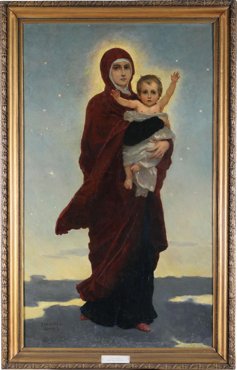 Перед вами эскиз росписи Владимирского собора в Киеве, где Виктор Васнецов работал с 1885 по 1896 год. Создание образа Богоматери с Младенцем художник считал главным делом своей жизни. Васнецова волновала грандиозность задачи, способы ее разрешения. «Что можно сделать после таких мастеров, как Рафаэль и Мурильо, — говорил он, — чтоб критика не упрекнула в подражании?» (по воспоминаниям Н. А. Прахова).