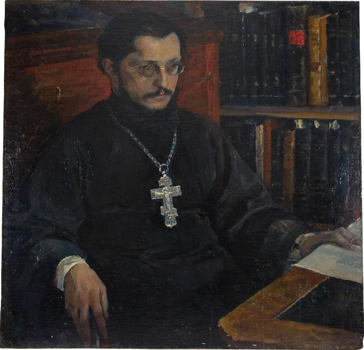 На портрете представлен близкий друг художника священник Сергей Дурылин. Он одет в черный подрясник, на груди – серебряный священнический крест. Дурылин сидит за рабочим столом в своем кабинете, на заднем фоне комод и книжная полка. Левой рукой он придерживает раскрытую на столе книгу, правая – повисла на подлокотнике кресла. Глаз не видно, их закрывают небольшие круглые очки. Неподвижности и общая скованность фигуры создает впечатление остановившегося в одной точке взгляда, когда человек погружен в глубокое раздумье.