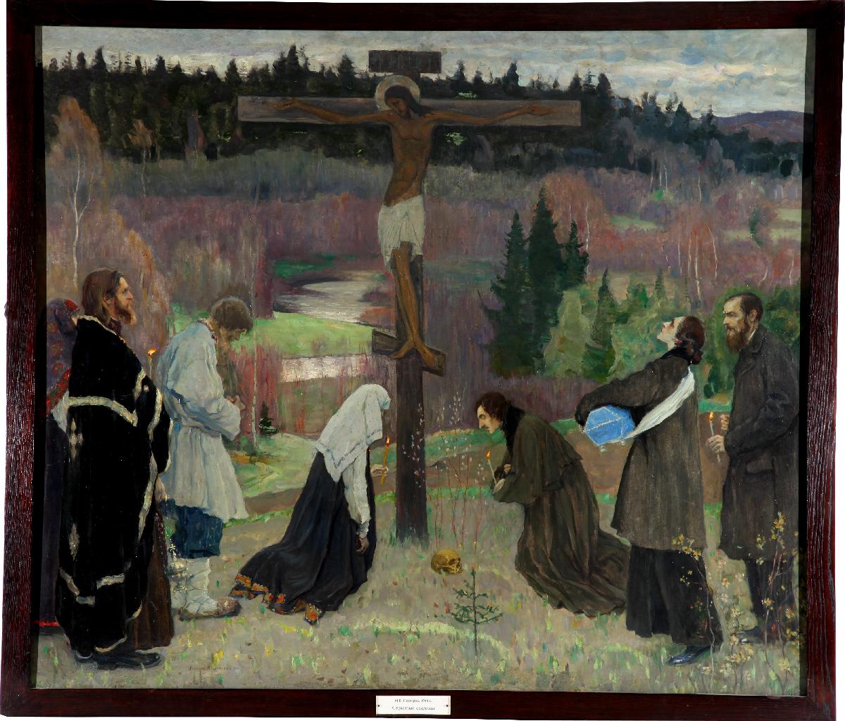 На картины на фоне среднерусского ландшафта с лесом и рекой изображено Распятие с предстоящими. В левой части композиции – священник Леонид Дмитриевский в богослужебном облачении, друг художника, с которым он познакомился в 1918 году в Армавире. Рядом со священником крестьянин и две женщины. В правой части – к Кресту подходят русские писатели: коленопреклоненная фигура Н. В. Гоголя и Ф. М. Достоевский с женой, которая несёт гробик с телом их маленького сына.