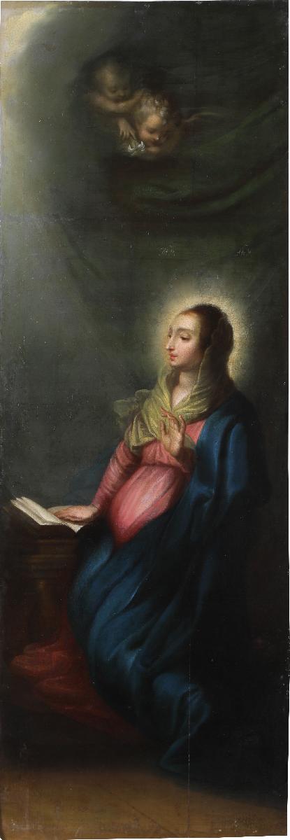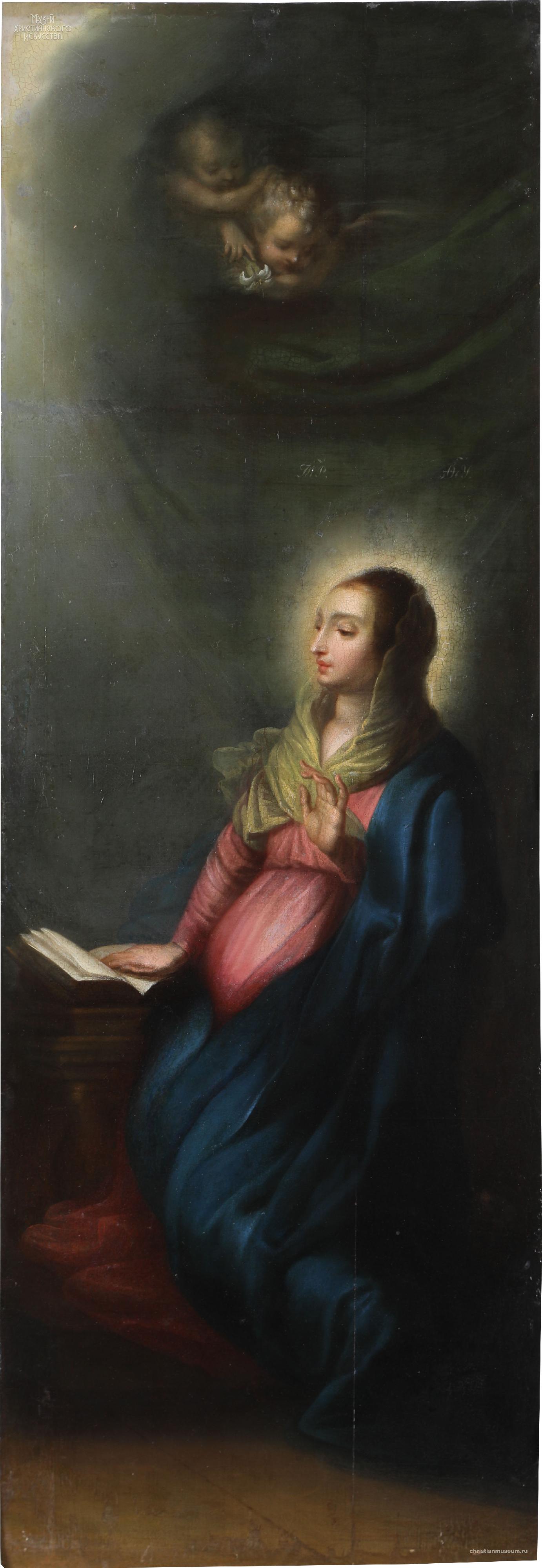 Подчеркнуто вытянутая композиция произведения указывает на его фрагментарность и предназначенность для храмового пространства, предположительно, часть диптиха «Благовещение». По своим иконографическим особенностям произведение восходит к образцам итальянской религиозной живописи. Дева Мария изображена в малиновом хитоне, облегающем живот, и темно-синим гиматии; голову покрывает легкий свело-зеленый платок с золотистой отделкой, концы которого спускаются Ей на грудь. Правой рукой Она придерживает раскрытую книгу, левая, развернутая ладонью наружу, – у груди. Лик озаряет едва заметная полуулыбка, что вносит в образ оттенок сдержанной теплоты. Вверху из темноты фона проступают изображения головок двух херувимов.