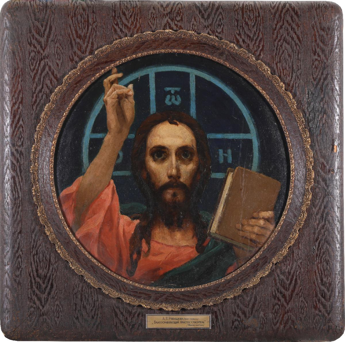 Картина представляет собой тондо в квадратное раме. В центре ̶ погрудное изображение благословляющего Христа на темно-коричневом фоне. Правой рукой он благословляет, в левой ̶ держит закрытое Евангелие. Спаситель облачен в киноварно-красный хитон и сине-зеленый гиматий. Хотя манера исполнения произведения отвечает классической выучке мастера, светло-голубой крещатый нимб вокруг головы Христа написан в иконном стиле: идеально круглый, с греческими буквами ὁ ὤν (“Сущий”). Иконография произведения восходит к фрескам в куполах древнерусских церквей. Возможно, картина имеет отношение к серии эскизов 1890-х годов для поновления росписи Софийского собора в Новгороде.