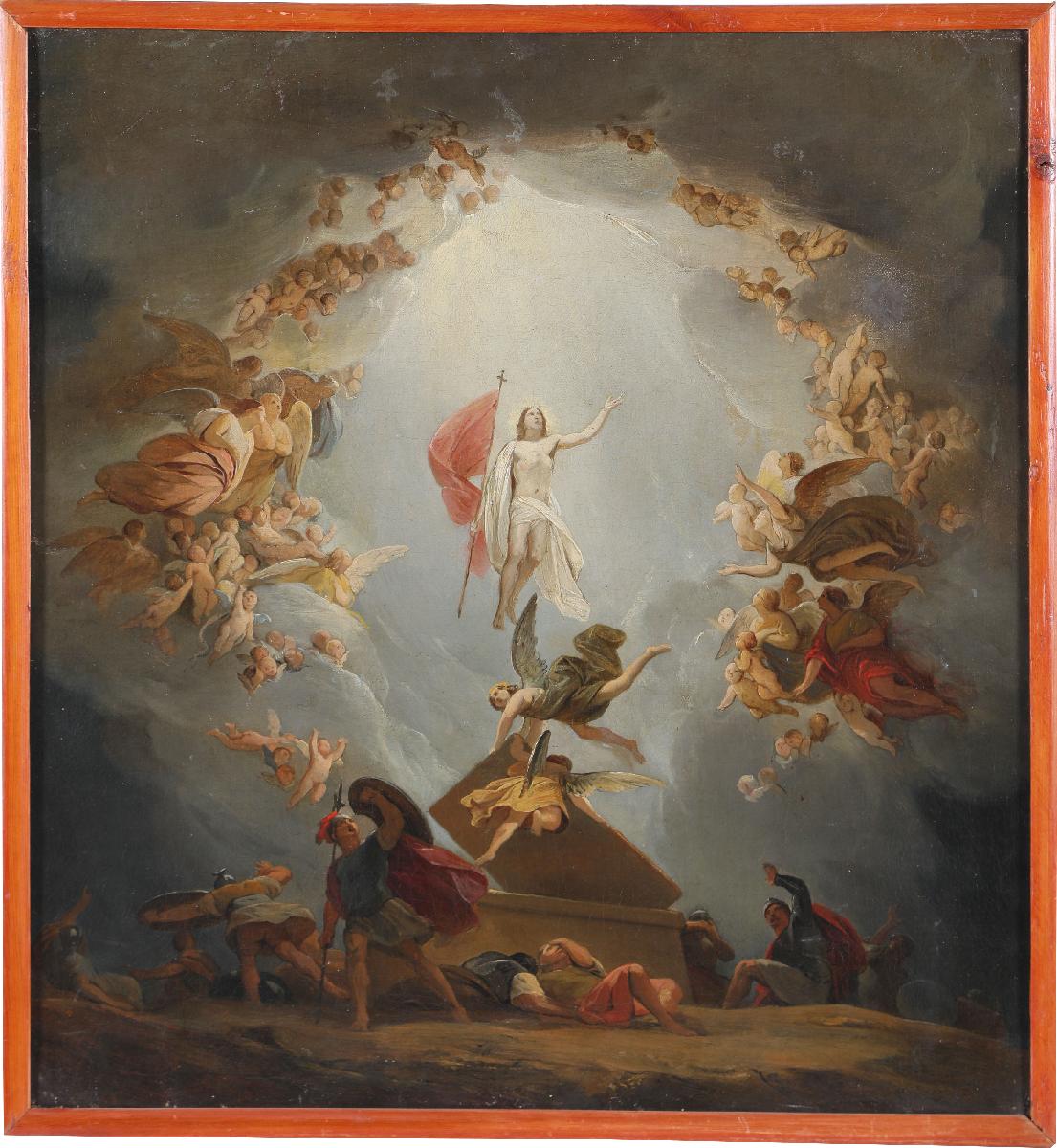 В центре – возносящаяся в небеса фигура воскресшего Христа в белых одеждах. Его левая рука воздета к небу, в правой – красное знамя победы на тонком длинном древке, завершающемся небольшим крестиком. Христа «окружает» сонм торжествующих ангелов, через просвет облаков льется божественный свет. Внизу изображен гроб, по типу римских саркофагов, его открытую крышку придерживают ангелы. На земле в страхе лежат поверженные римские воины. Иконография произведения восходит к европейскому средневековому искусству, в котором Воскресение Христово изображалось как «Восстание из гроба». В русской иконописи этот вариант также был распространен в XVII-XVIII столетиях.