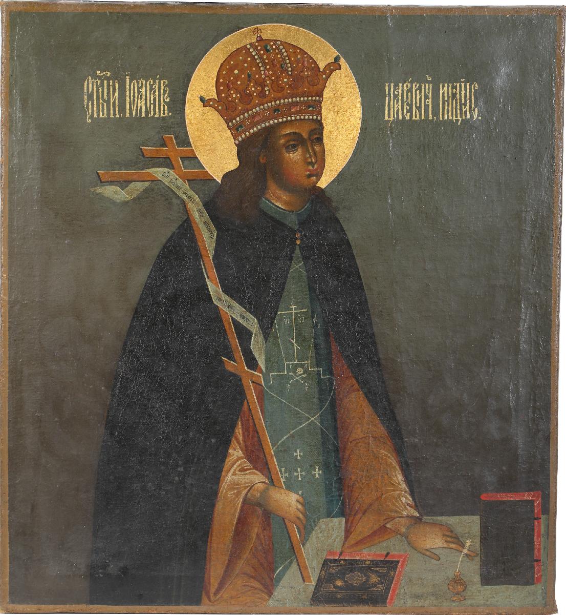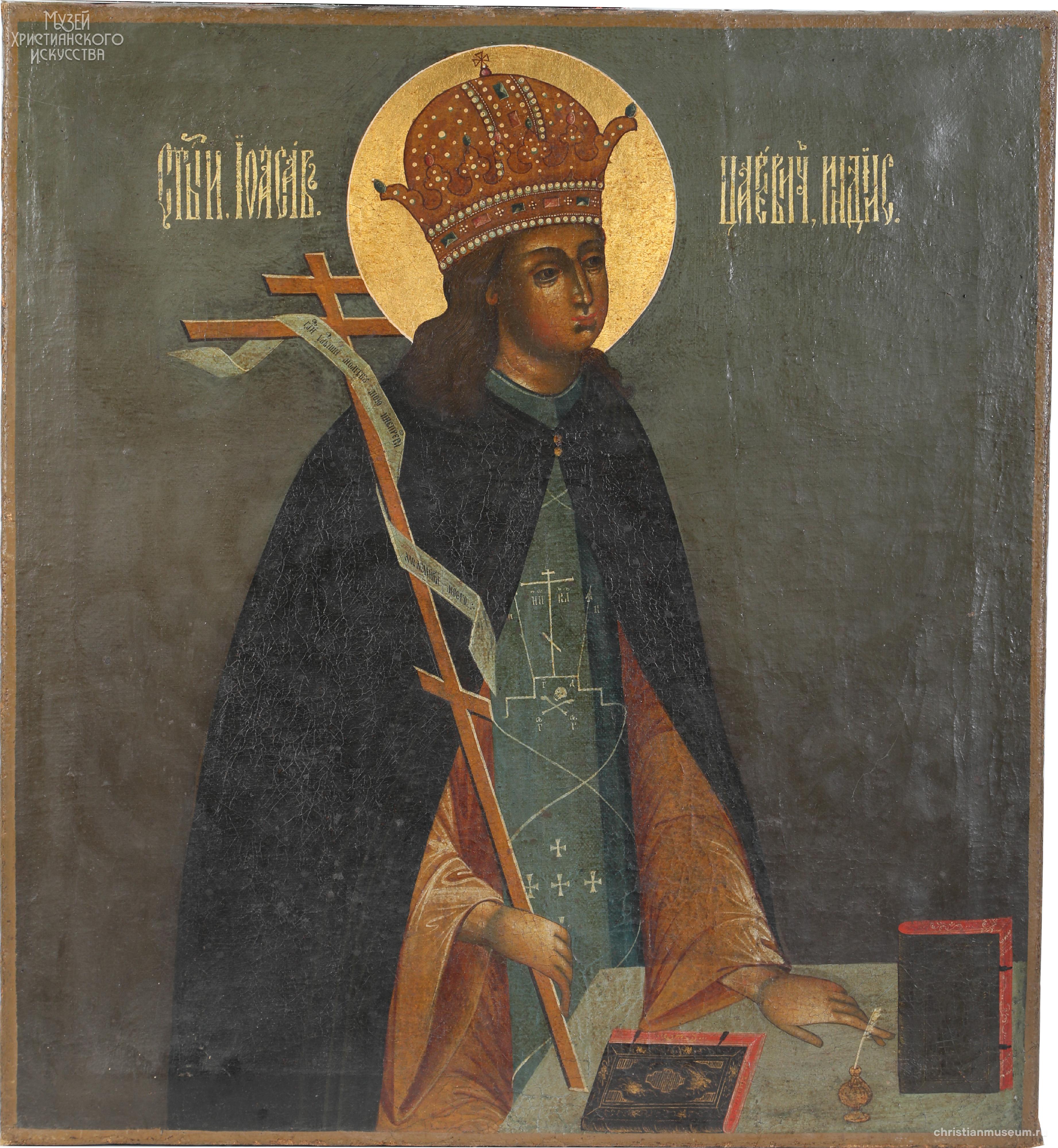 Поясное изображен преподобного Иоасафа, царевича Индийского. Перед ним на столе лежат книги и чернильница с пером, они указывают на ученые занятия святого. В левой руке – восьмиконечный крест с лентой, на которой написано: “Господи, услыши молитву мою и не призри моления моего”. Царевич облачен в монашеские одежды, длинные темные волосы ниспадают локонами на плечи, на голове – золотой венец с драгоценными камнями и жемчугом, по сторонам надпись вязью “Иоасав царевич индийс(кий)”. Стиль письма личного напоминает «живоподобную» манеру Оружейной палаты, при этом одежды исполнены в более плоскостной иконописной стилистике, складки моделированы пробелами и притенениями. Фон также плоский, оливкового цвета, легким градиентом переходит из коричневого внизу к более зеленому вверху.