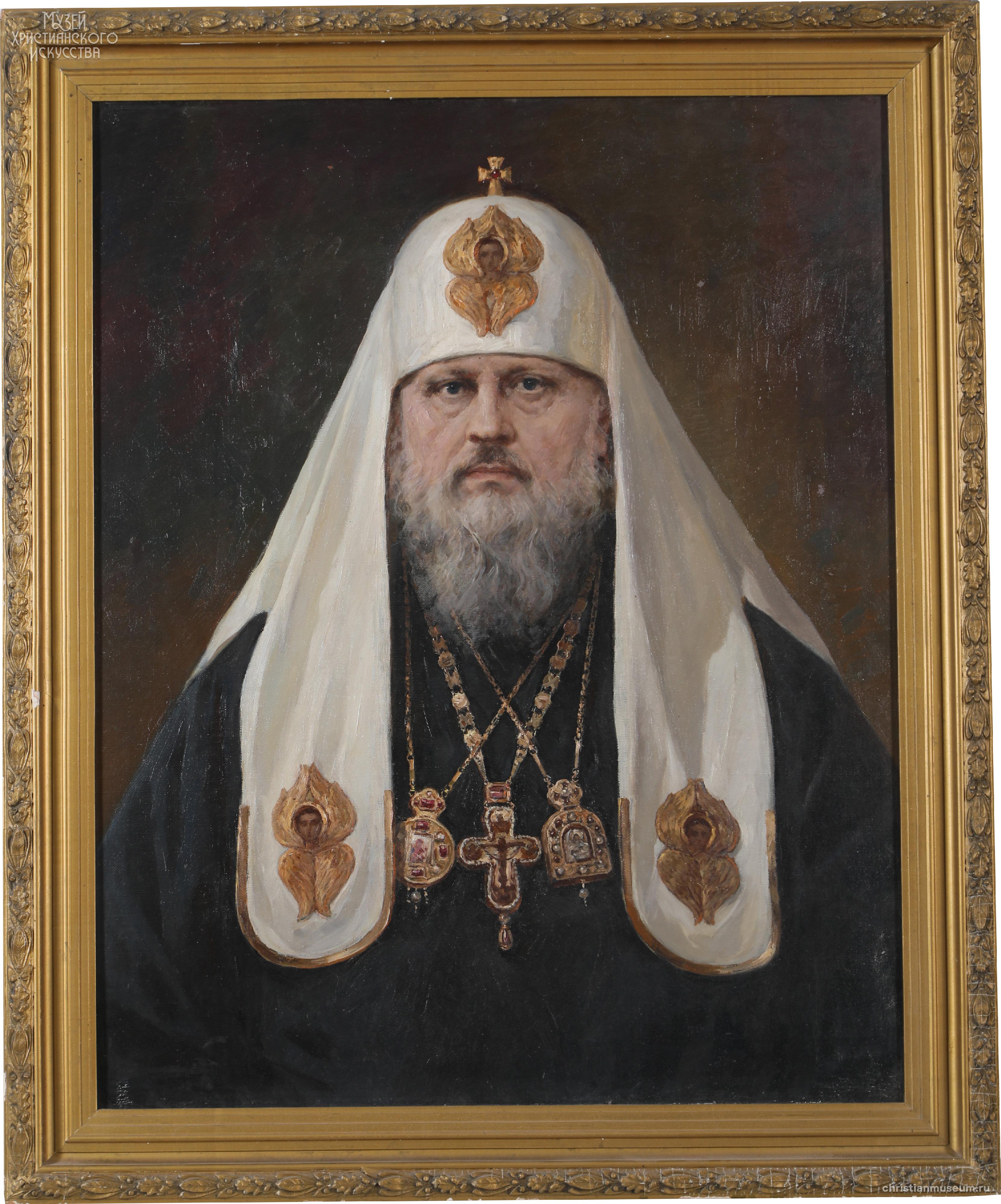Поясной фронтальный портрет Святейшего партиарха Пимена (Извекова) в патриаршем куколе. На груди крест с украшениями и две панагии.