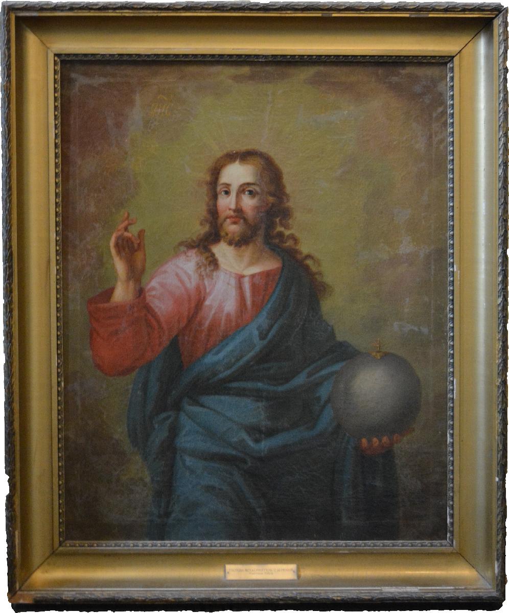 Живописный победренный образ Спаса Вседержителя. Правая рука сложена в имясловном благословении, в левой руке Господь держит сферу серого цвета с небольшим золотистым крестом. Одежды традиционны для иконографии Христа: красный хитон и темно-синий гиматий. В легком трехчетвертном повороте головы и ниспадающих на плечи золотистых локонах прослеживается обращение к западноевропейским образцам. Фон – облачный. Вместо нимба – золотое свечение вокруг головы, вверху по сторонам надписи под титлом «ИС ХС».