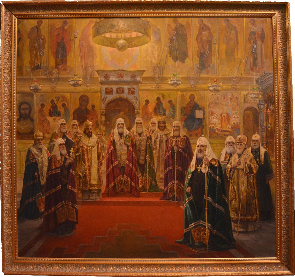 На картине в интерьере Троицкого собора Троице-Сергиевой Лавры изображены первосвятители Русской православной церкви досинодального периода и после восстановления патриаршества.