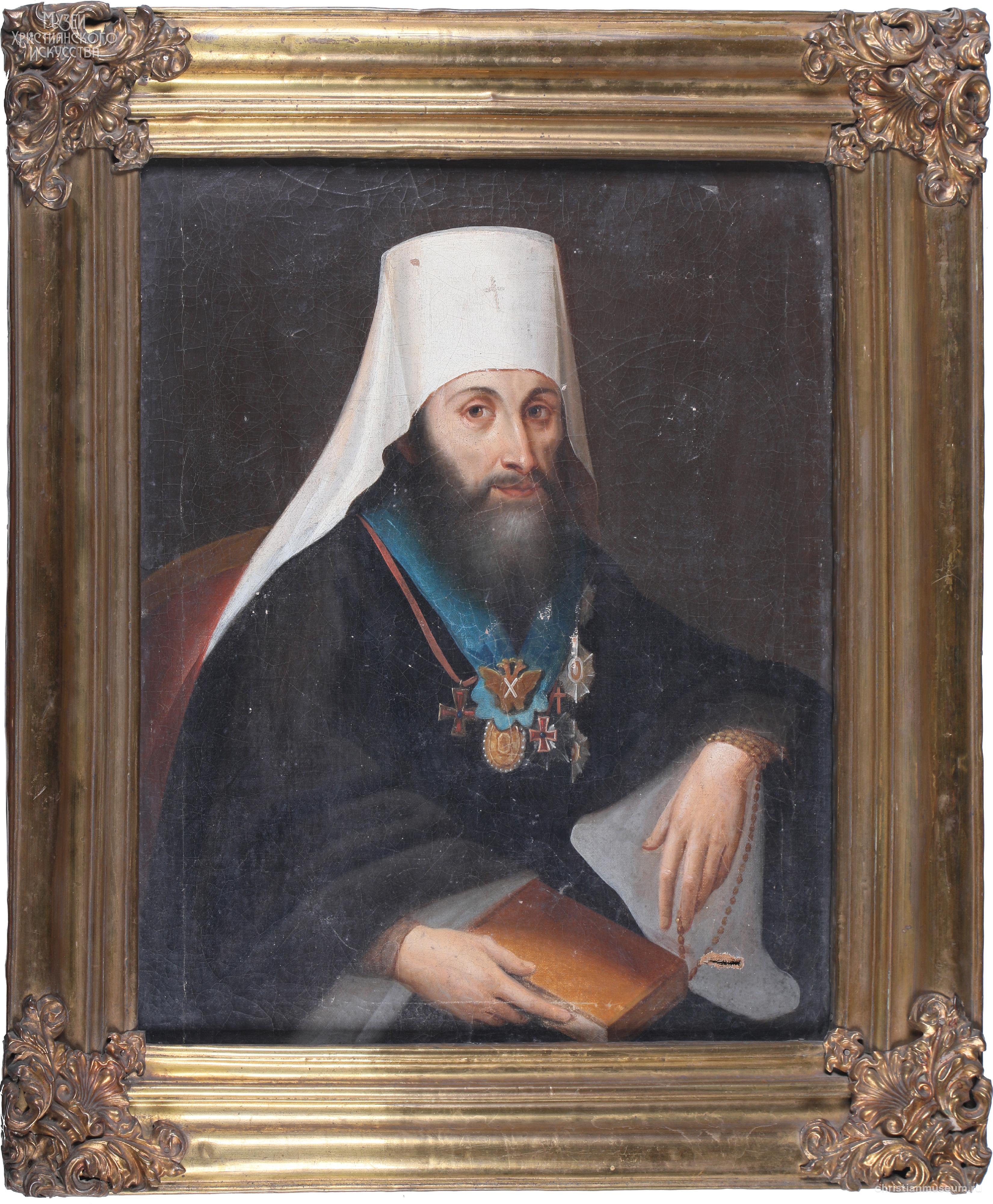 На портрете митрополит Филарет (Дроздов) изображен в кресле; фигура в трехчетвертном повороте вправо. Облачен в рясу и белый клобук. На груди – панагия, крест и награды: орден святого апостола Андрея Первозванного, орден святого князя Александра Невского, орден святого князя Владимира и орден святой Анны. Правая рука придерживает лежащую на коленях книгу, левая – с четками опирается на подлокотник кресла.