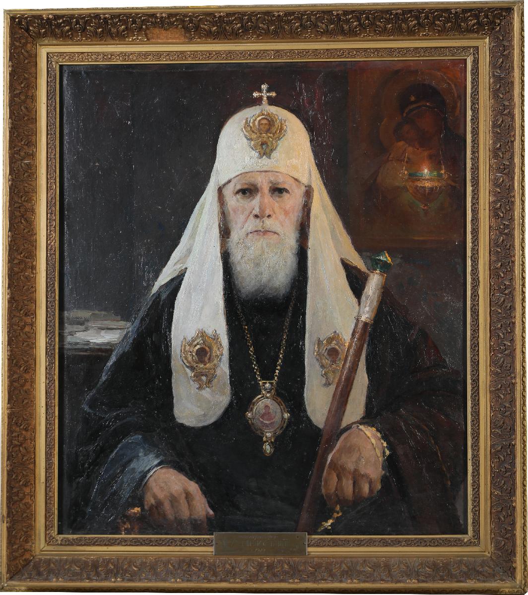 Патриарх Алексий I (Сергей Владимирович Симанский, 1877-1970) – богослов, педагог, кандидат юридических наук (1899), доктор богословия (1949). Происходил из дворянского рода, его отец вышел в отставку в звании камергера Императорского двора. После окончания юридического факультета Московского государственного университета, в 1900 году поступил в Московскую духовную академию. Через два года в Гефсиманском скиту Троице-Сергиевой Лавры пострижен в монашество ректором академии епископом Арсением (Стадницким). В 1913 году Высочайшим указом назначен епископом Тихвинским, 2-м викарием Новгородской епархии. После революции, в январе 1920 года вместе с митрополитом Арсением был арестован Новгородской ЧК, однако вскоре оба архиерея были освобождены. С 1927-1935 – член Временного патриаршего Священного синода, легализации которого удалось добиться заместителю Патриаршего местоблюстителя митрополиту Сергию (Страгородскому). В 1933 году, по уходе на покой митрополита Серафима (Чичагова), становится областным митрополитом Ленинградским (относились все епархии, находившиеся в границах Ленинградской области того времени). Во время блокады Ленинграда оставался в городе, совершал литургии и молебны, проповедовал, ободрял и утешал верующих. 4 сентября 1943 года вместе с митрополитами Сергием (Страгородским) и Николаем (Ярушевичем) присутствовал на встрече со Сталиным в Кремле. На Поместном соборе Русской православной Церкви 2 февраля 1945 года митрополит Алексий был избран Патриархом Московским и всея Руси. 10 апреля 1945 года состоялась ещё одна его встреча со Сталиным. Занимал московский Патриарший престол более 25 лет – дольше всех в истории Русской церкви. Скончался 17 апреля 1970 года, в канун Лазаревой субботы, в патриаршей резиденции в Переделкине на 93-м году жизни, погребен в крипте Успенского собора Троице-Сергиевой Лавры.