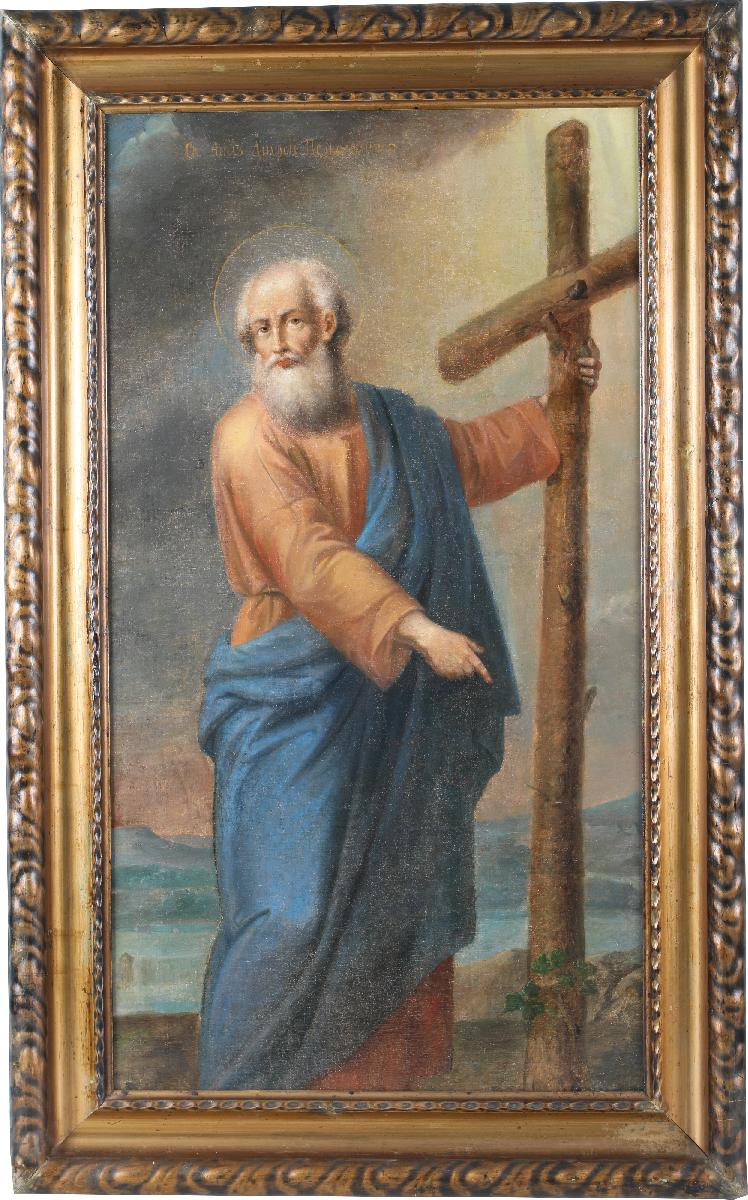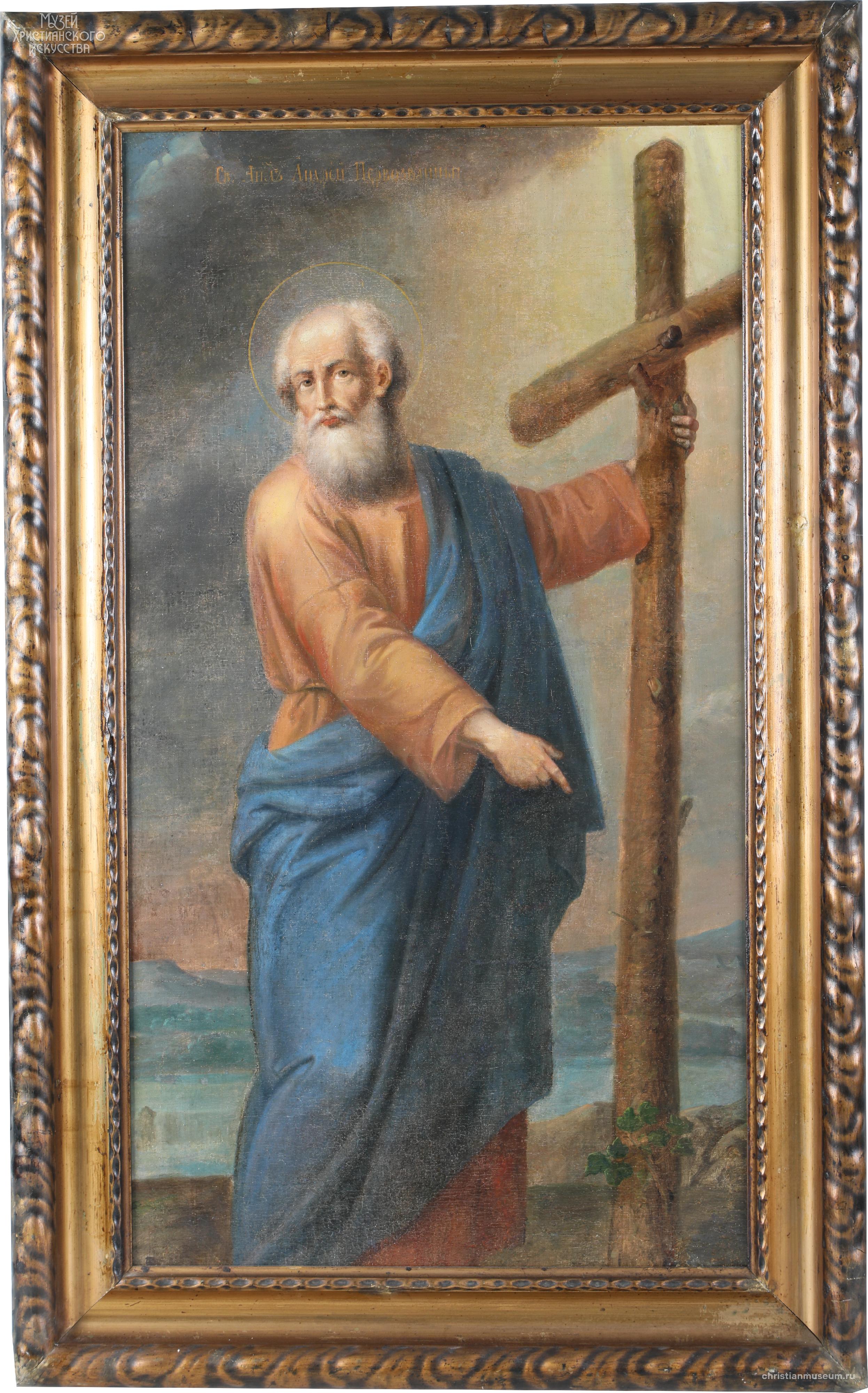 Живописное изображение апостола Андрея Первозванного представляет ростовое изображение святого на берегу водоёма и холмистой местности на заднем плане. Голова апостола в трехчетвертном повороте влево, вокруг тонкий нимб, выше надпись «Св Аплъ Андрей Первозванный». Облачен в оранжево-охристый хитон и синий гиматий. Левой рукой святой держит высокий крест, грубо сложенный из стволов молодых деревьев, а правой – указывает на небольшой зеленый росток, пробивающийся у его подножия.