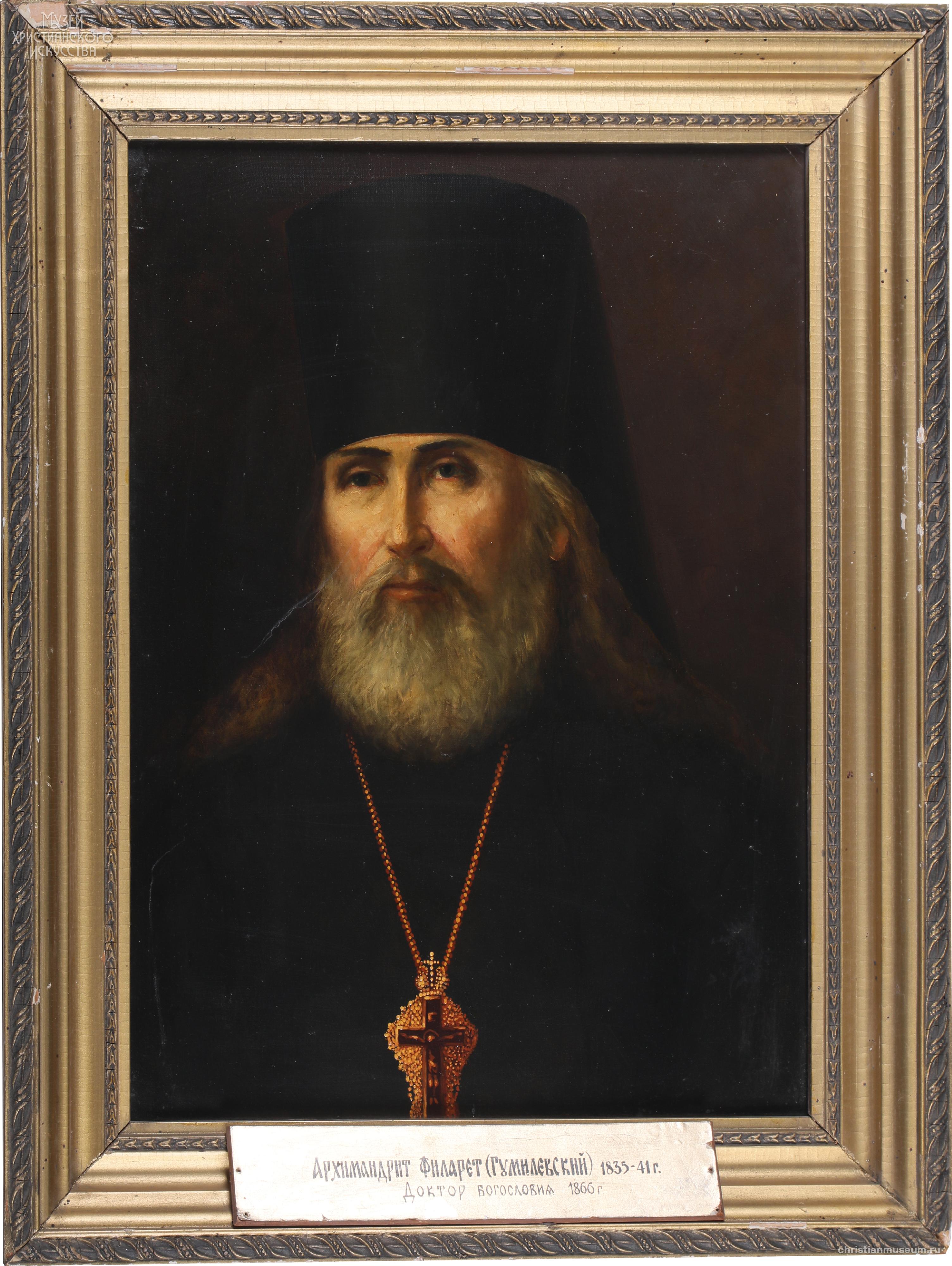 На поясном портрете архиепископ Черниговский и Нежинский Филарет (Гумилевский) изображен в сане архимандрита, в те годы, когда он был ректором Московской духовной академии (1835-1841).