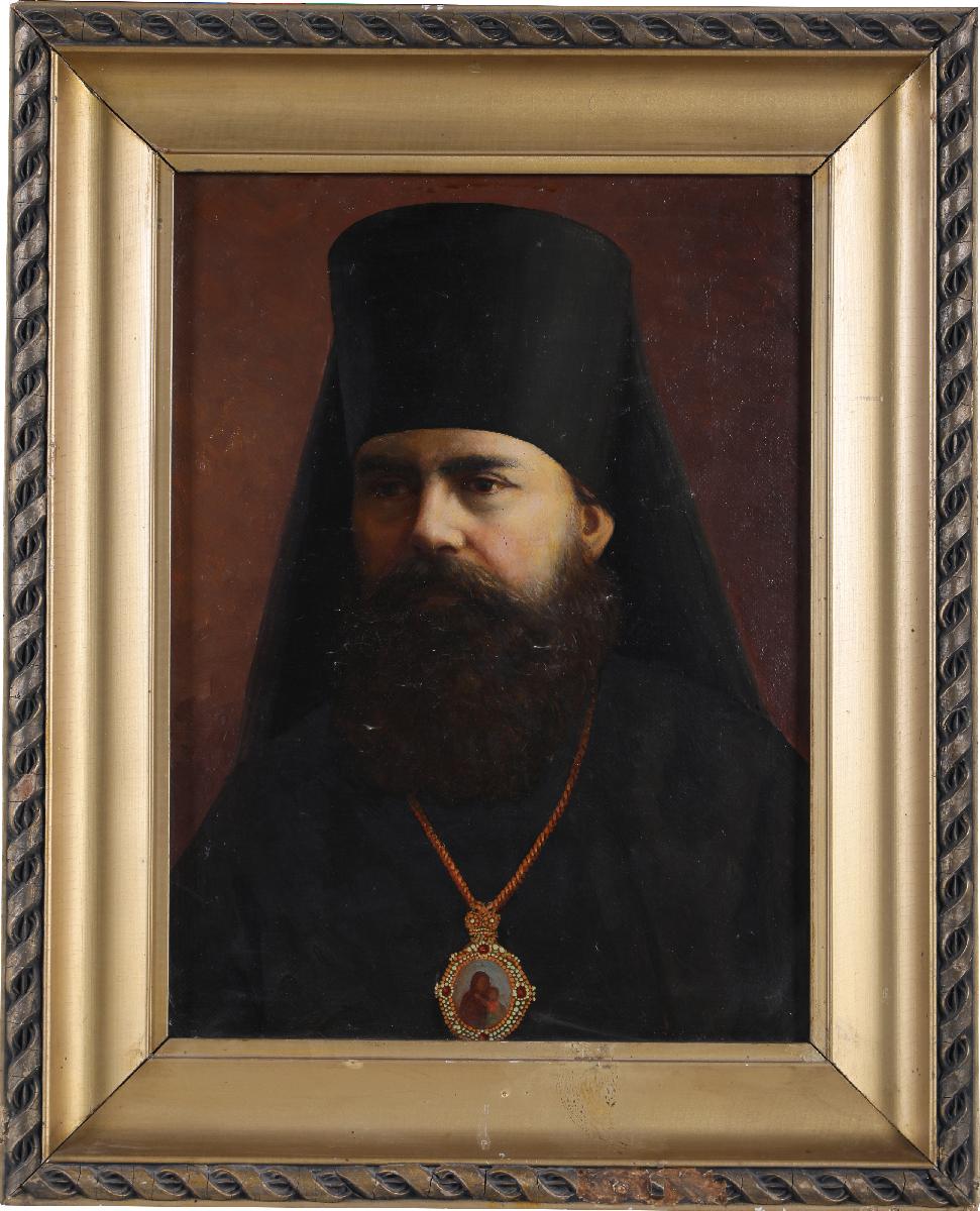 На поясном портрете еписком Арсений изображен в трехчетвертном повороте влево, облачен в рясу и черный клобук, на груди – панагия с образом Богоматери "Одигитрия".