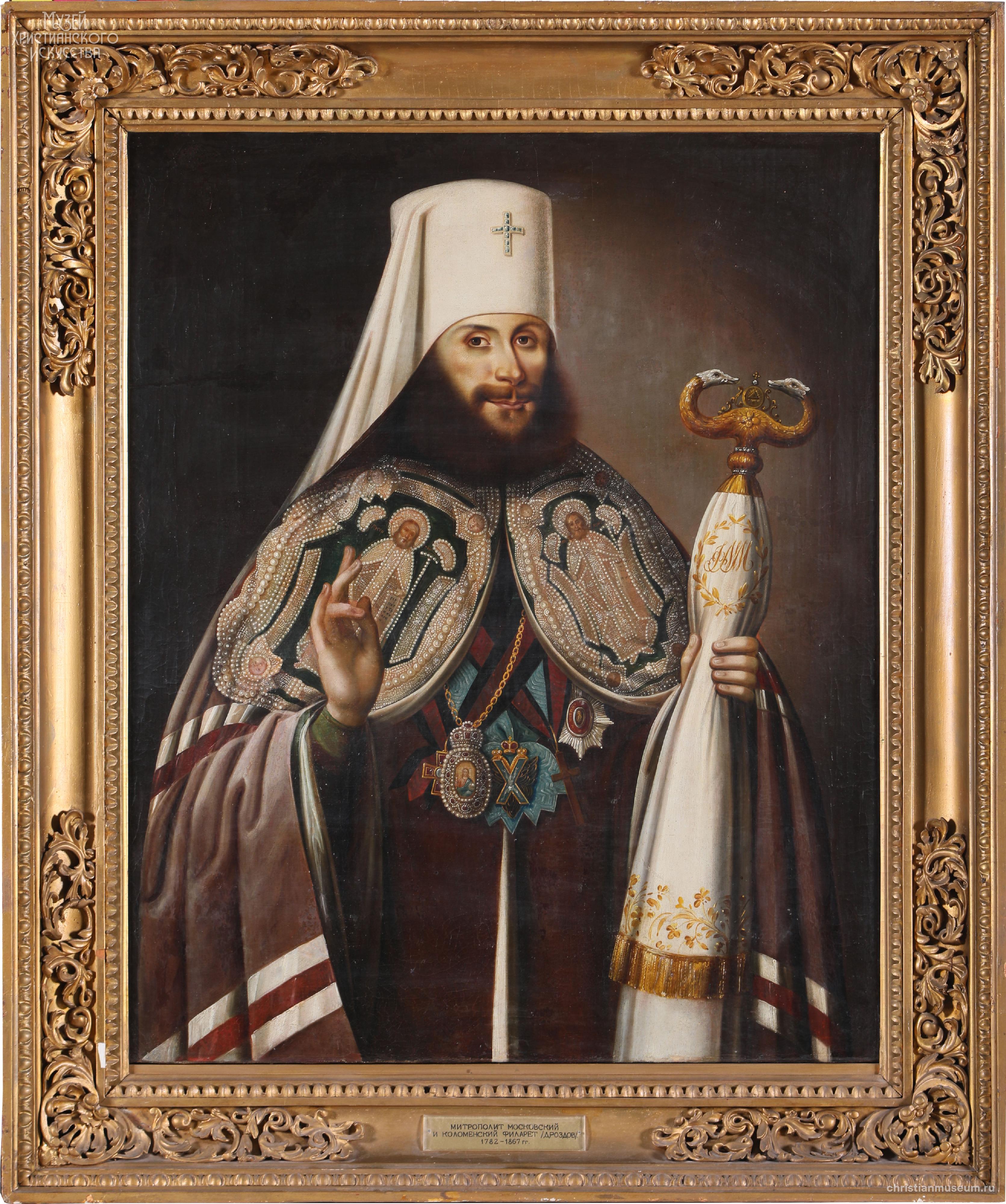 На поясном портрете святитель Филарет изображен в трехчетвертном повороте вправо, облачен в мантию священноархимандрита Троице-Сергиевой Лавры с вышитыми на скрижалях образами преподобных Сергия и Никона Радонежских и в белом клобуке. Правая рука сложена в благословляющем жесте, в левой – жезл с длинным сулоком, на котором вензель «ФММ» (Филарет, митрополит Московский). На груди – панагия, орденский знак и звезда Святого Андрея Первозванного (без алмазных знаков), орден Святого князя Владимира. Алмазных знаков к ордену святитель был удостоен в 1849 году. На портрете из музейного собрания знаки отсутствуют, что позволяет датировать его началом 1840-х годов.
