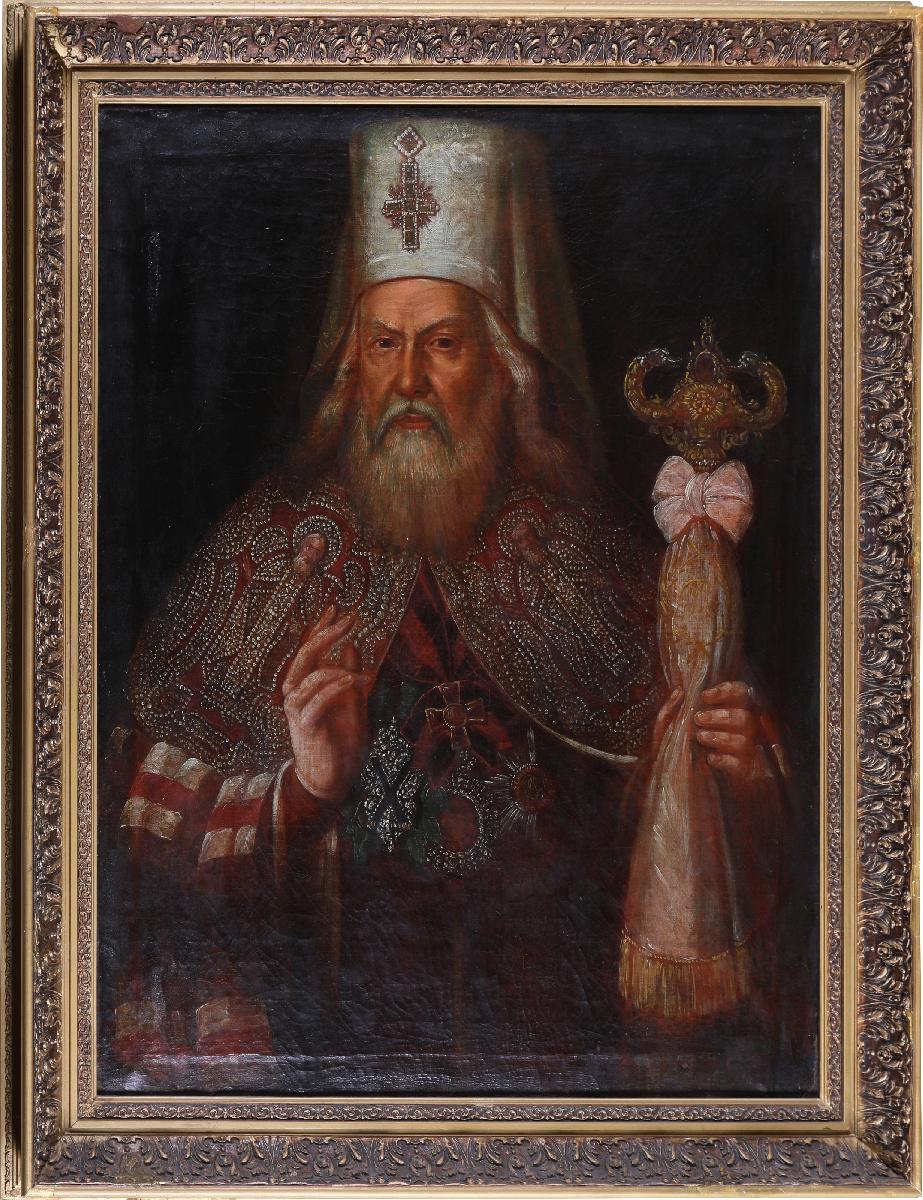 На поясном портрете митрополит Платон изображен в трехчетвертном повороте влево. Он облачен в мантию священноархимандрита Троице-Сергиевой Лавры с вышитыми жемчугом ростовыми образами преподобных Сергия и Никона Радонежских на скрижалях и в белом клобуке с крестом из драгоценных камней. На груди – панагия, орден и звезда Святого Андрея Первозванного с алмазами, орден Святого князя Владимира II степени. Правая рука сложена в благословляющем жесте, в левой – жезл с длинным сулоком, который подвязан у навершия розовым бантом.