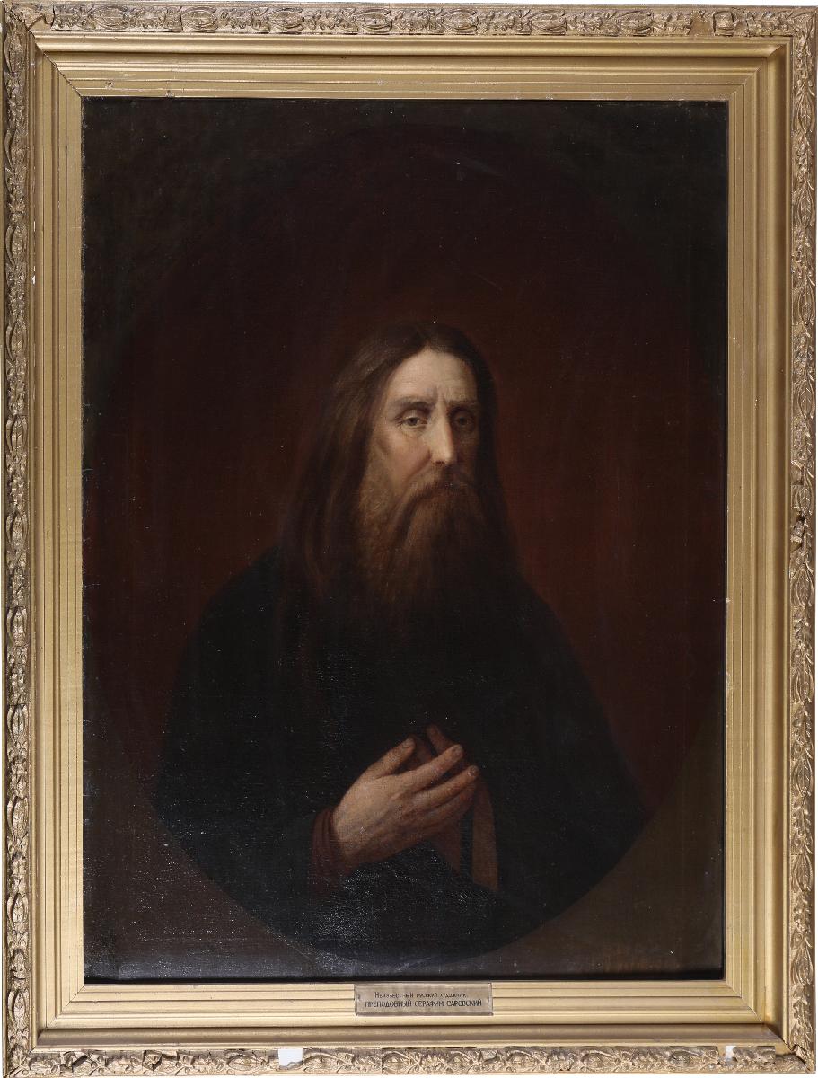 На поясном овальном портрете, заключенном в квадратную раму, преподобный Серафим Саровский изображен в трехчетвертном повороте вправо. Облачен в рясу, голова непокрыта, руки сложены в молитвенном жесте на груди, правая поверх левой. На левой руке – четки.