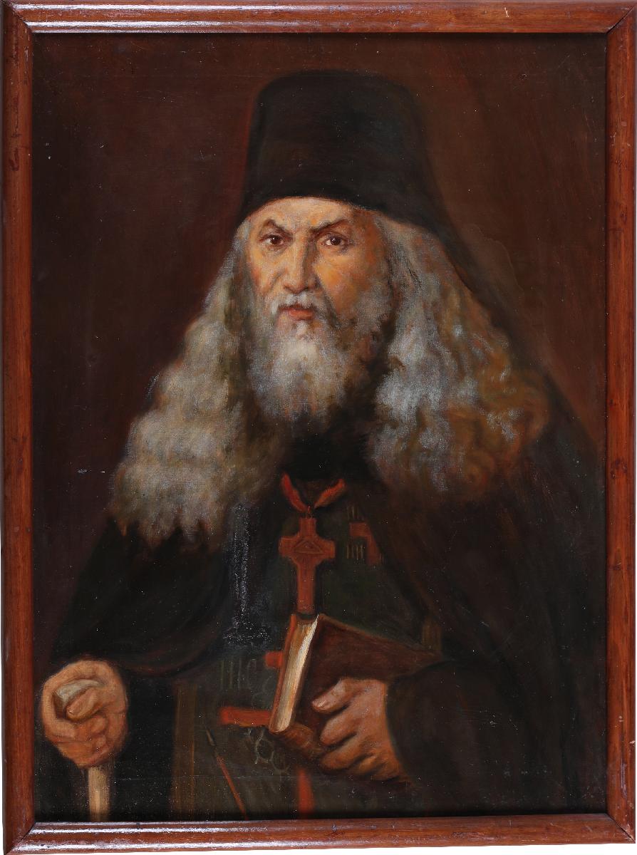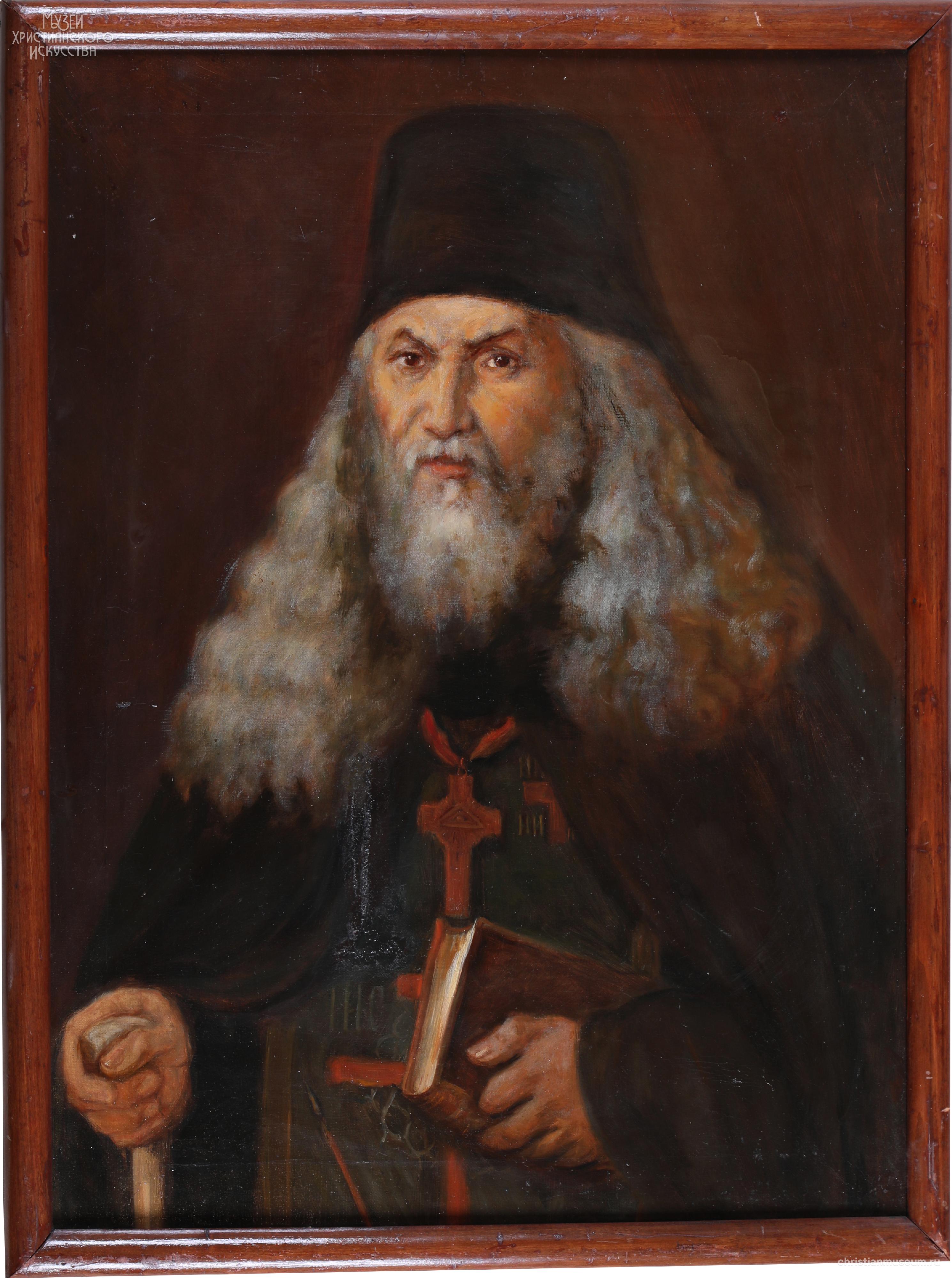 Живописное поясное изображение иеросхимонаха Льва Оптинского. Старец облачен в схимнические одежды, черную мантию и клобук; на груди – резной деревянный крест. Правой рукой он опирается на деревянную палку, в левой – держит книгу.
