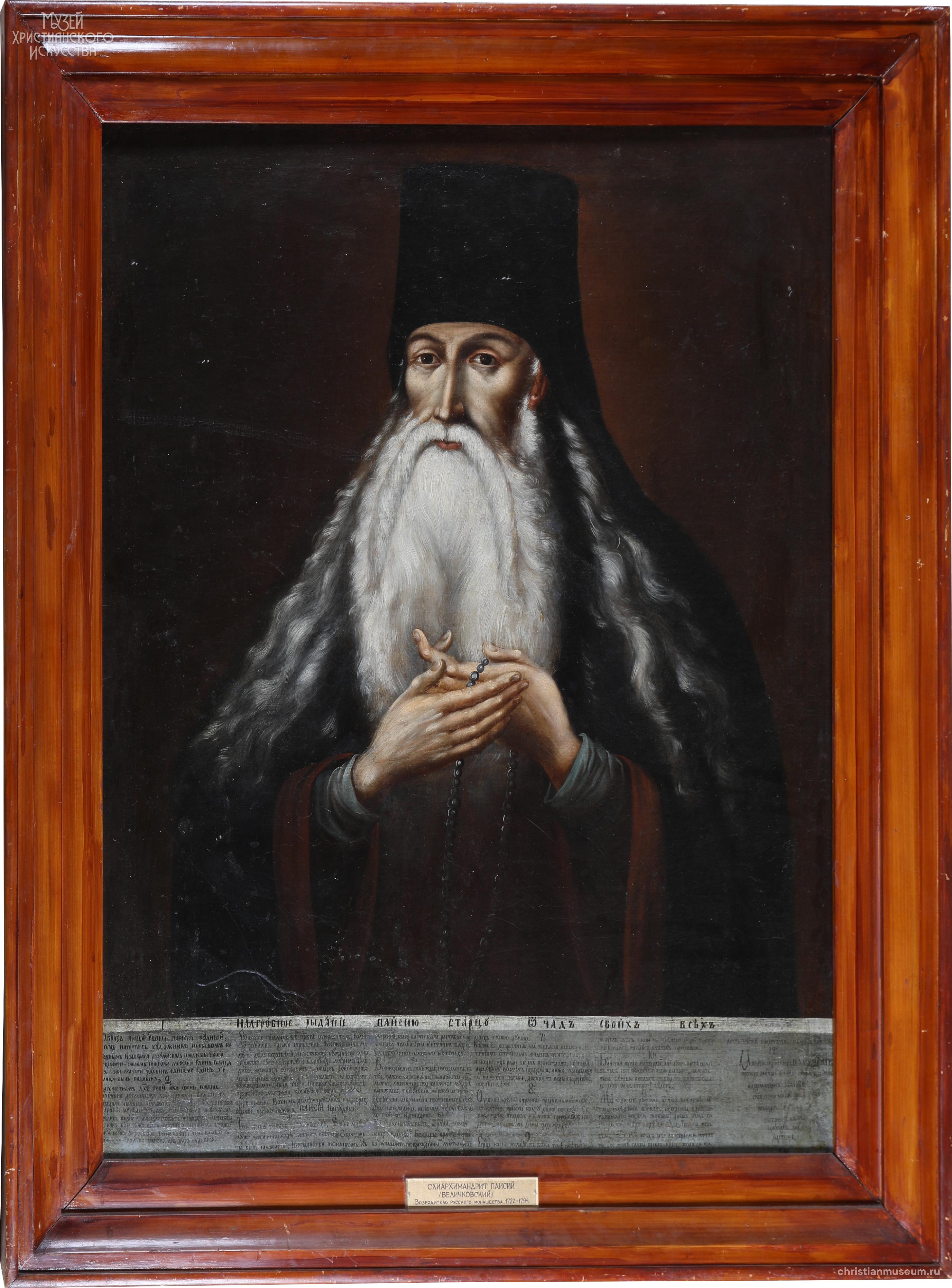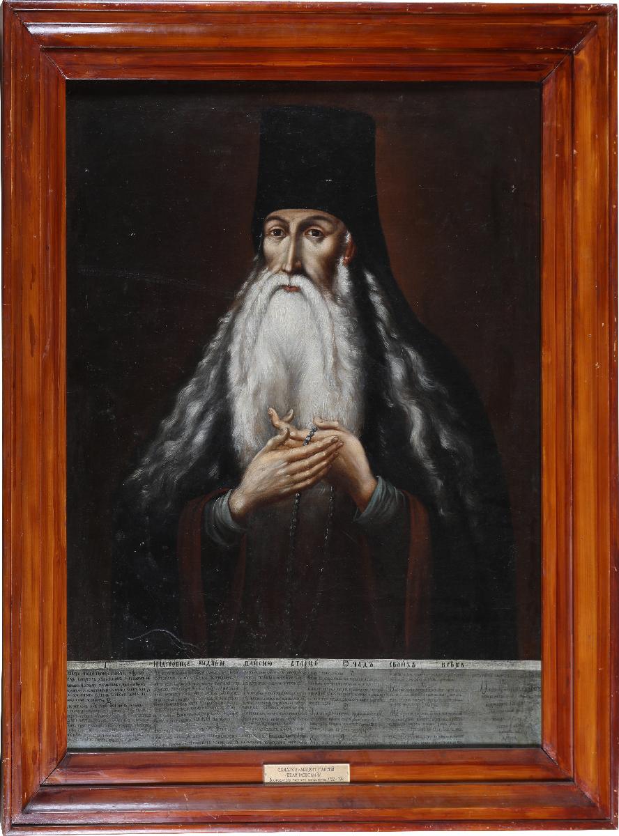 Портрет схиархимандрита Паисия (Величковского) создан вскоре после смерти схиархимандрита в духовной среде его учеников и последователей. Старец представлен в монашеском одеянии с четками в руках, что подчеркивает его подвиг «умного делания». Лик передает портретные черты подвижника. Манера изображения рук, написанных в стилистике XVIII века, деликатная разделка прядей волос и бороды, четкость написания личного выдаёт мастера высокой профессиональной культуры. Под изображением – 12 виршей: «НАДГРОБНОЕ РЫДАНИЕ ПАИСИЮ СТАРЦУ ОТ ЧАД СВОИХ ВСЕХ». Таким образом, можно говорить о том, что портрет восходит к традиции надгробного изображения, иконография которого легла в основу иконописного образа святого после его канонизации.