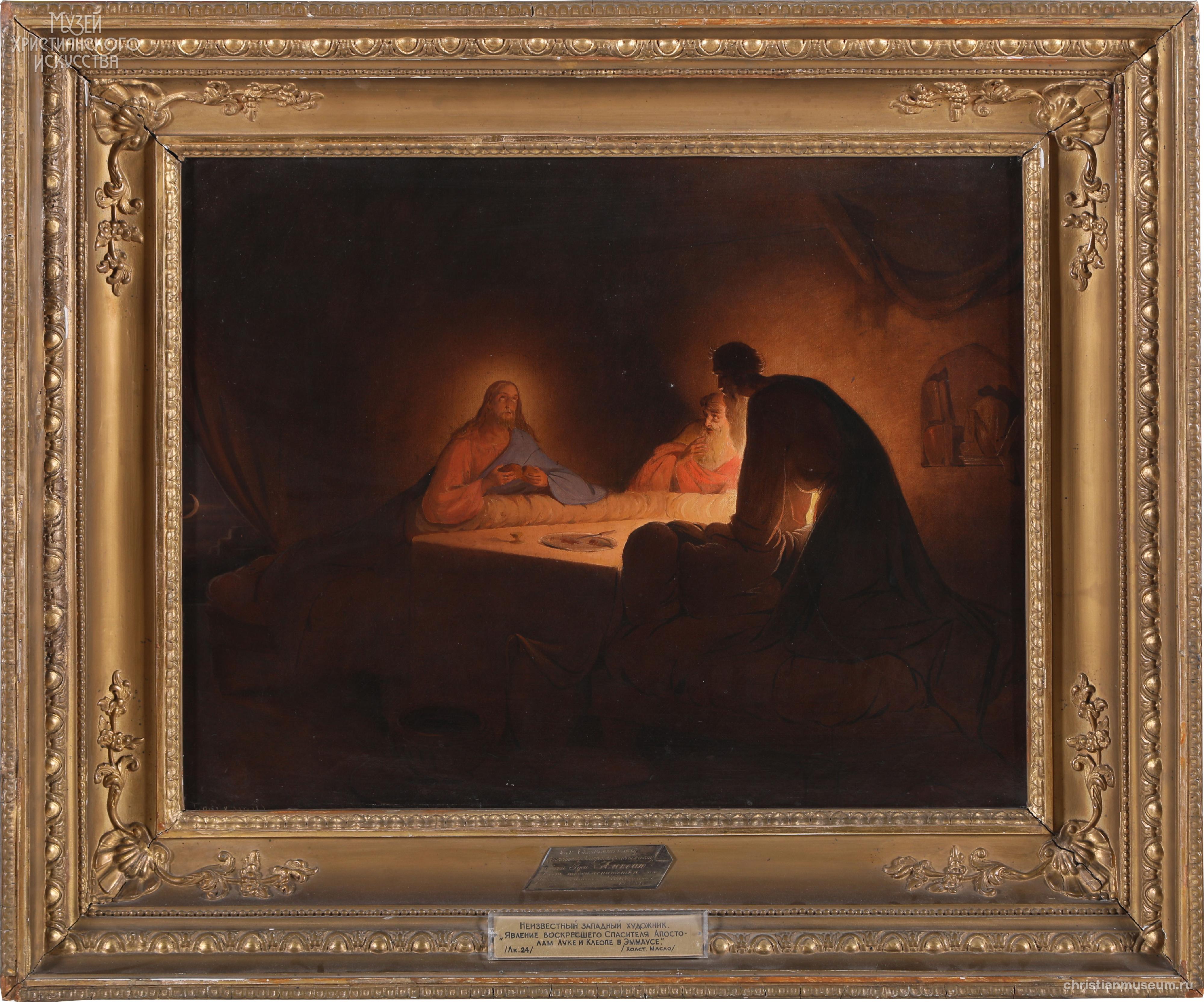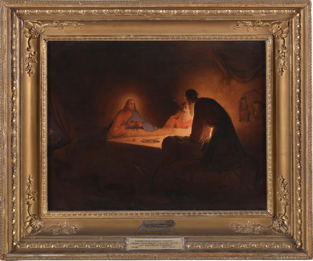 Темное пространство комнаты освещено одним источником света, который исходит от светильника на столе. Он освещает центральную группу – возлежащего по восточной традиции за трапезой Христа, преломляющего хлеб. Он облачен в традиционные для иконографии Спасителя красный хитон и синий гиматий, вокруг головы – сияние. Справа от Господа – фигура одного из учеников. Взгляд обращен на Христа; приоткрытый рот, наморщенный лоб и приподнятая рука выражают его изумление. Фигура другого ученика в тени и изображена со спины, он стоит на коленях на ложе, опершись руками о подушки. Скромный интерьер комнаты – ниша с книгами справа и несколько драпировок, через открытый полог у входа виден условный ночной пейзаж.