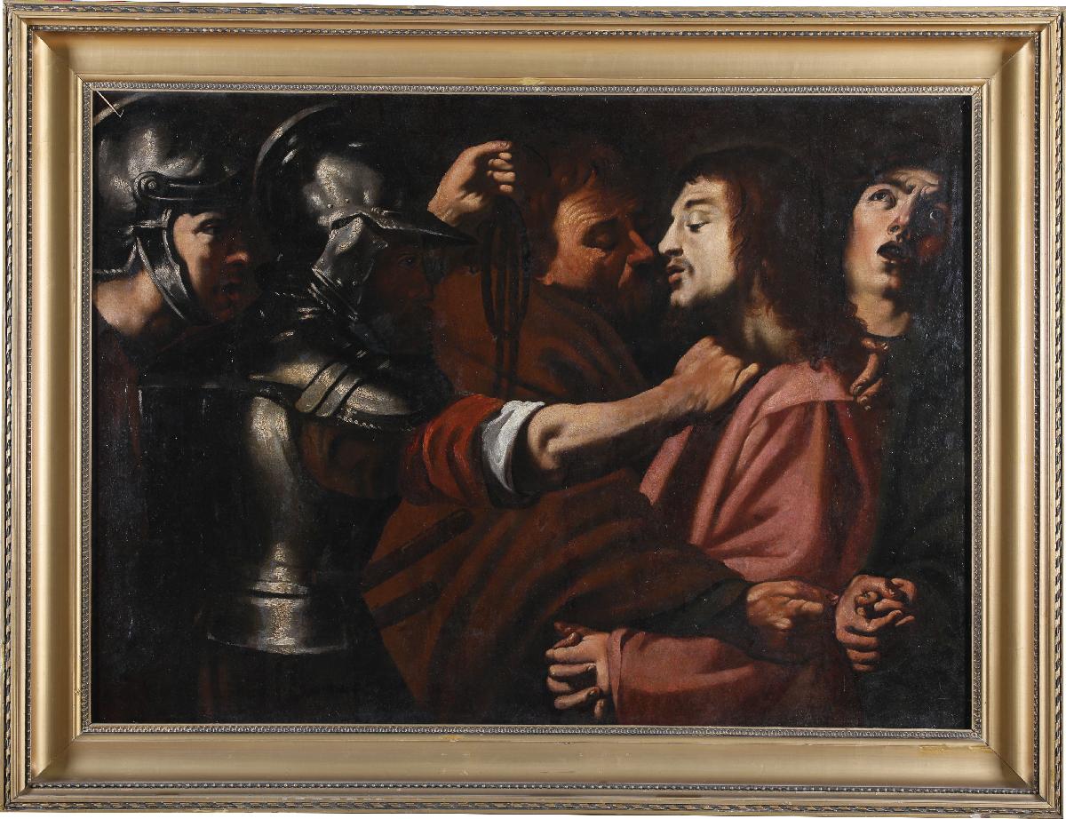 Многофигурная композиция включает в себя пять персонажей, которые плотно «втиснуты» в пространство картины, что создает эффект «присутствия», вовлеченности и добавляет драматизм изображенному на картине событию. В правой трети полотна – фигура Иисуса в светло-красном хитоне развернута практически в профиль, руки сжаты в замок, лицо освещено, глаза полузакрыты. Облик Христа выражает покорность происходящему. Справа за спиной Господа – фигура Его ученика: голова приподнята, взгляд направлен вверх, рот приоткрыт, руки сжаты в замок, всё это передает его испуг и недоумение. В левой части –две фигуры воинов в римских доспехах. Один из воинов правой рукой схватил Христа за ворот одежды, в левой он держит моток веревки. По центру – фигура Иуды в темно-красном плаще, развернута к Иисусу. Его лицо находится в тени, освещенной остается только правая щека и висок. Правой плотно сжатой рукой Иуда обхватывает Христа за предплечье, левой – за шею.