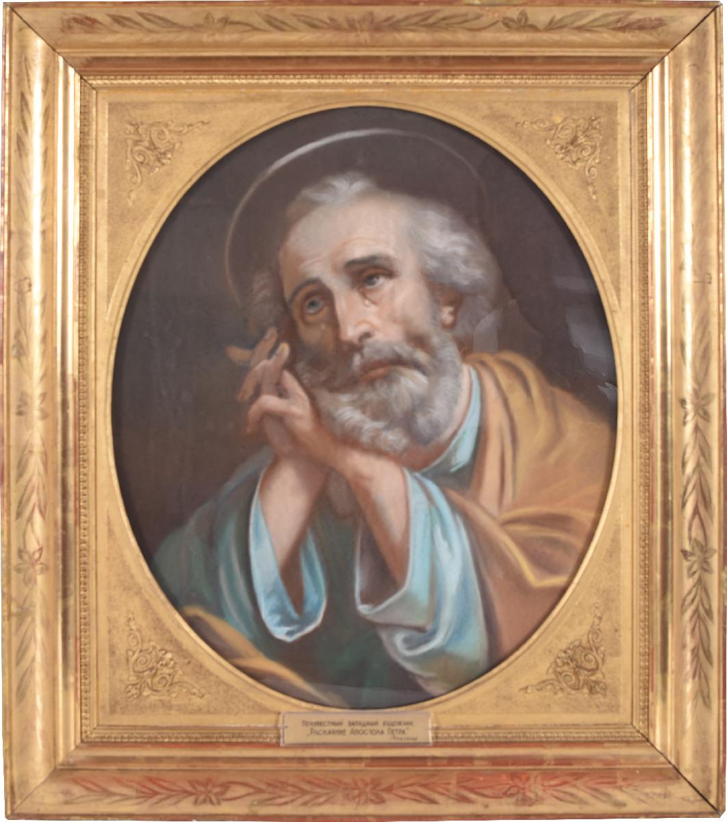 Картина овальной формы, вставлена в квадратную раму, представляет погрудное изображение апостола Петра в легком повороте влево. Голова опирается на сложенные в молении руки, взгляд направлен вверх, в глазах видны слезы. Одежды апостола – хитон голубого цвета и золотисто-охристый гиматий. На заднем плане – условный пейзаж.
