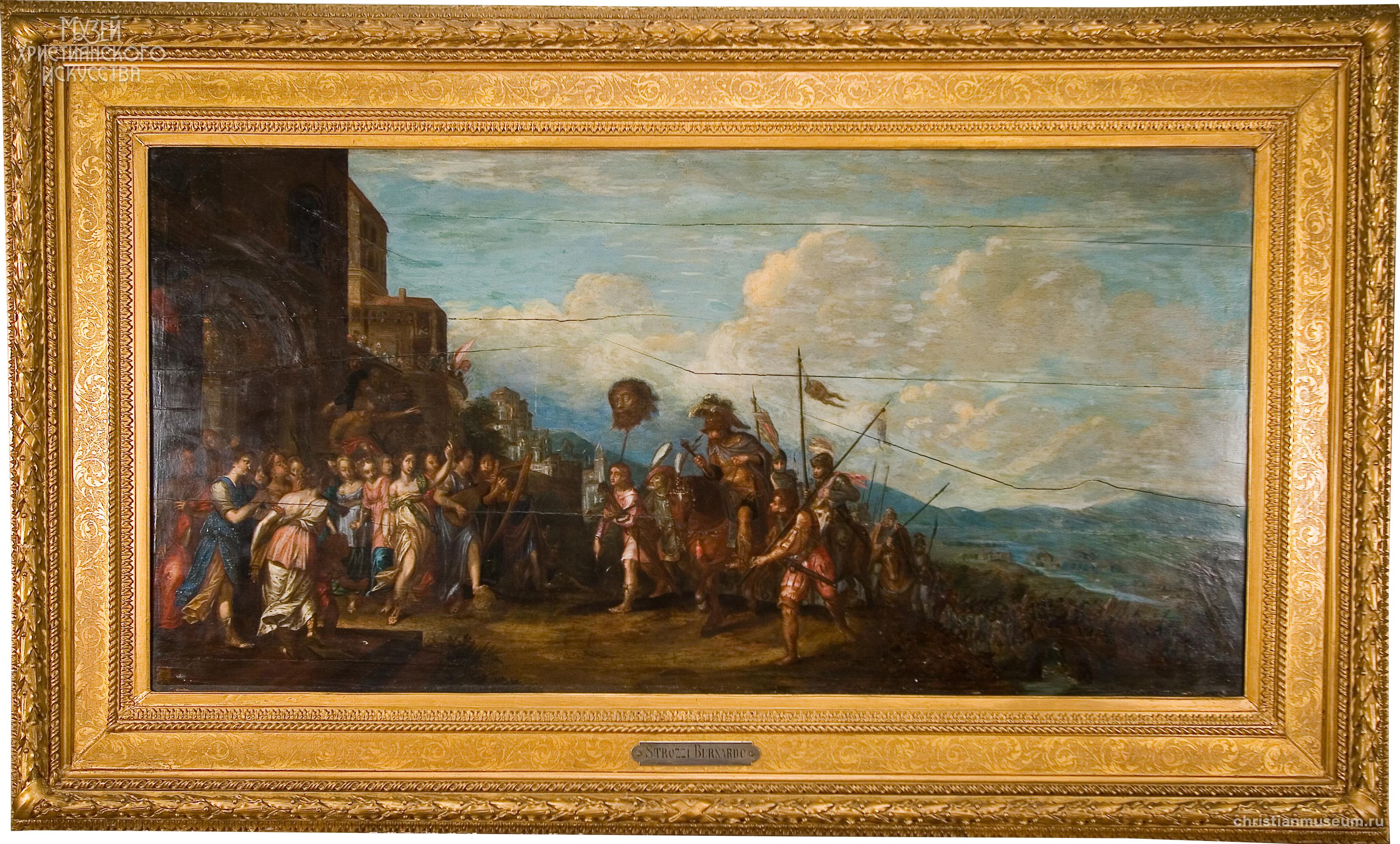 Сюжетом для картины стал ветхозаветный эпизод из истории еврейского народа, описанный в 17 главе Первой Книги Царств. Во время войны между племенами израильтян и филистимлян юный пастушок Давид прославился победой над великаном Голиафом. Войска противников стояли на поле брани друг против друга. Давид, пришедший в это время проведать старших братьев и видя, что никто не решается помериться силами с врагом, сам вызвался вступить в единоборство. Для поединка Давид взял только пращу и камень. Призывая имя Господа Саваофа, он побежал навстречу противнику. Метко пущенный из пращи камень попал в лоб Голиафа, сразив его наповал. Устрашенные филистимляне обратились в бегство, а царь Саул приблизил к себе юного героя. Когда Саул и Давид возвращались с поля битвы, «женщины из всех городов Израильских выходили навстречу Саулу царю с пением и плясками, с торжественными тимпанами и с кимвалами. И восклицали игравшие женщины, говоря: Саул победил тысячи, а Давид – десятки тысяч! И Саул сильно огорчился, и неприятно было ему это слово, и он сказал: Давиду дали десятки тысяч, а мне тысячи; ему недостает только царства. И с того дня и потом подозрительно смотрел Саул на Давида» (1 Цар. 18: 6-9).