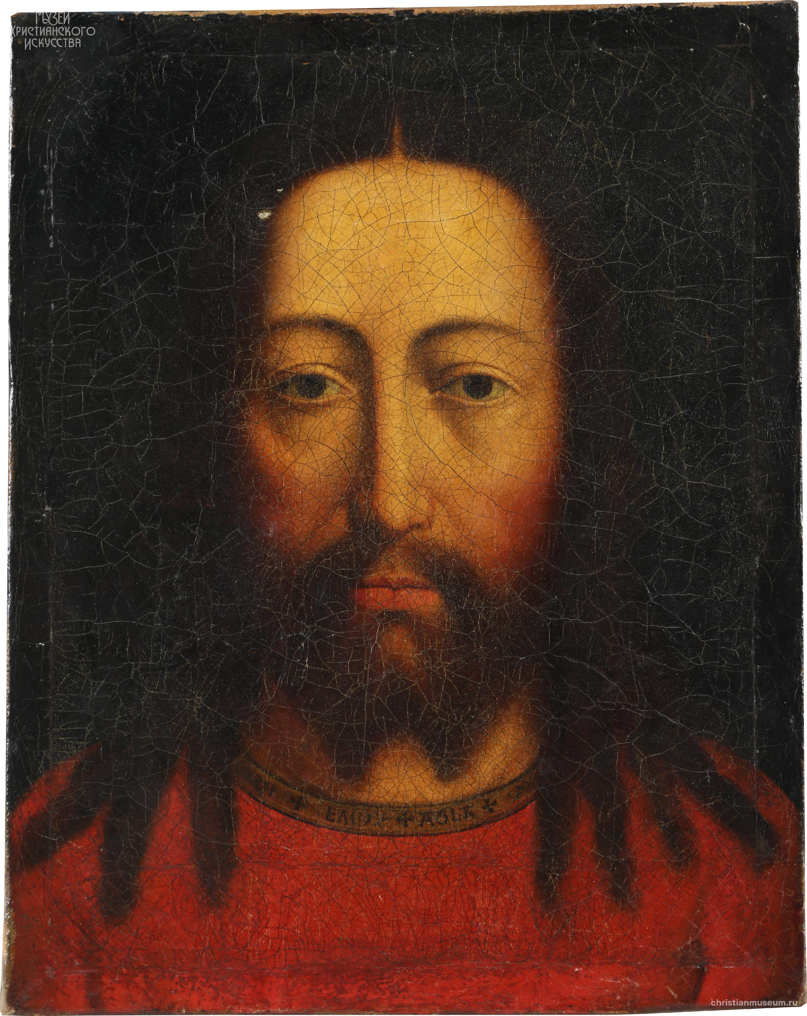 Фронтальное погрудное изображение Христа. На темном фоне хорошо виден лик с высоким лбом, глазами миндалевидной формы и прямым носом. Короткая борода разделена на две равные пряди. Локоны волос также разделены на пряди и разложены по плечам, по четыре с каждой стороны. Из одеяний виден ворот хитона, декорированный каймой золотистого цвета с буквами и маленькими четырехконечными крестиками.